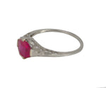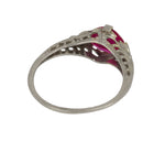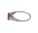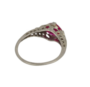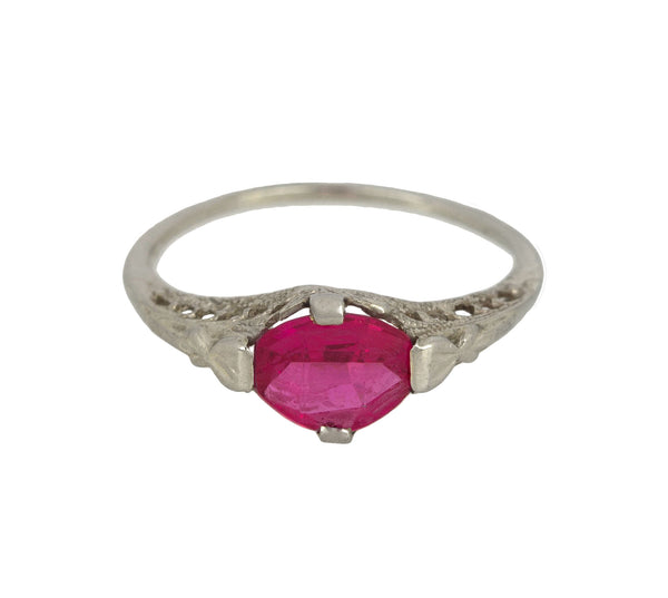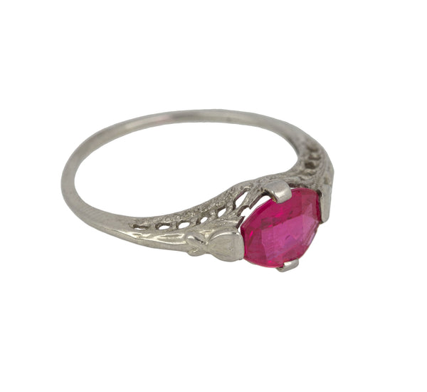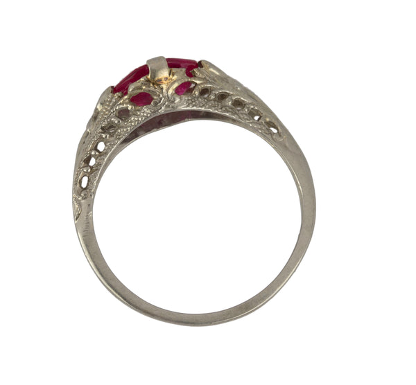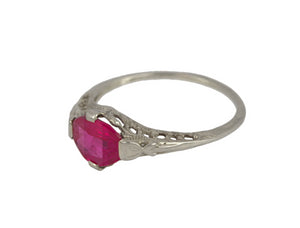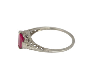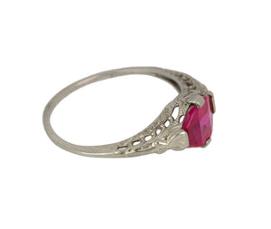 Antique Art Deco 14K White Gold Synthetic 6x6mm Red Ruby Glass Filigree Ring