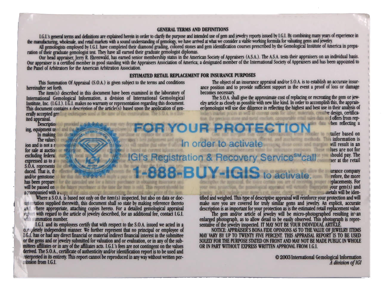 Yes, this item will include an I.G.I. Summation of Appraisal as well as a Collector's Coins & Jewelry certificate of appraisal and authenticity as per buyer request |