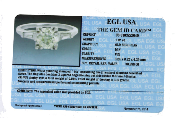 Ladies Modern 14K White Gold 1.07CT M-N Old European Diamond Engagement Ring EGL