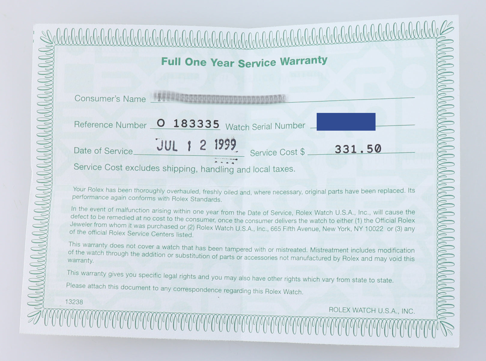One-Year Warranty ($400 Value - Included with your purchase). Collectors Coins & Jewelry warrants the dependable functioning of this entire watch for the period of one year from the date of purchase. This warranty does not cover normal wear and tear, loss, theft, tampering, mistreatment or modification through the addition or subtraction of parts or accessories not supplied by Collectors Coins & Jewelry. In the event of a malfunction arising within the warranty period, we will remedy the defect at no cost to the consumer |