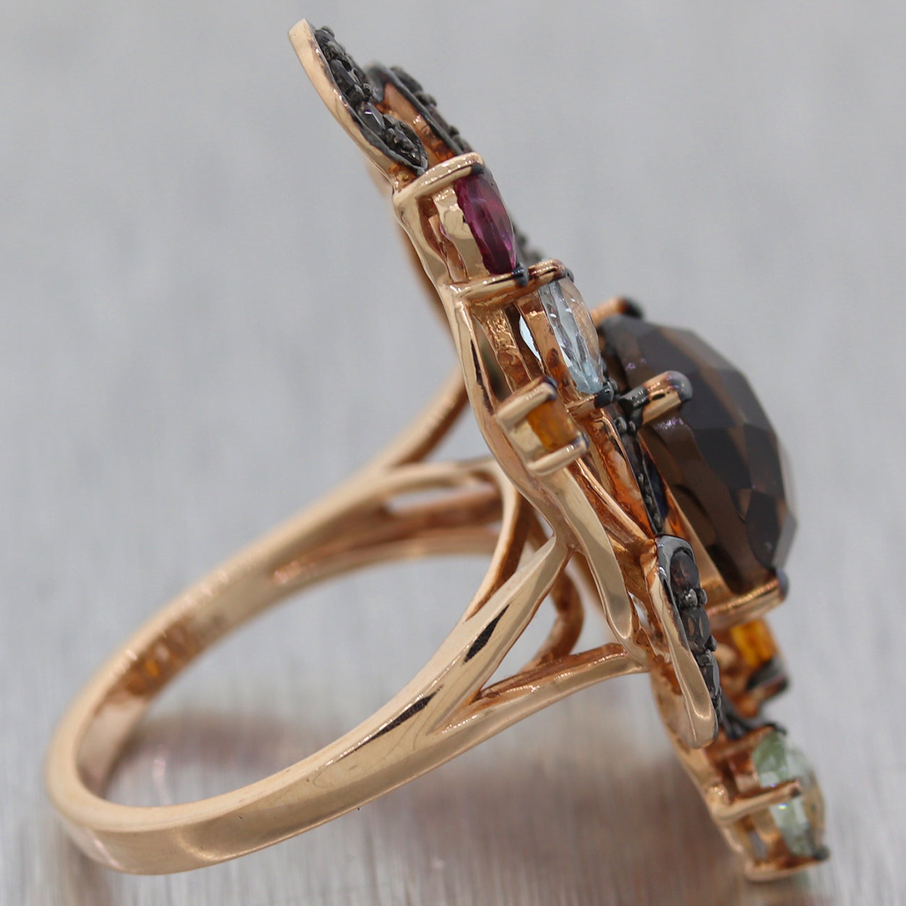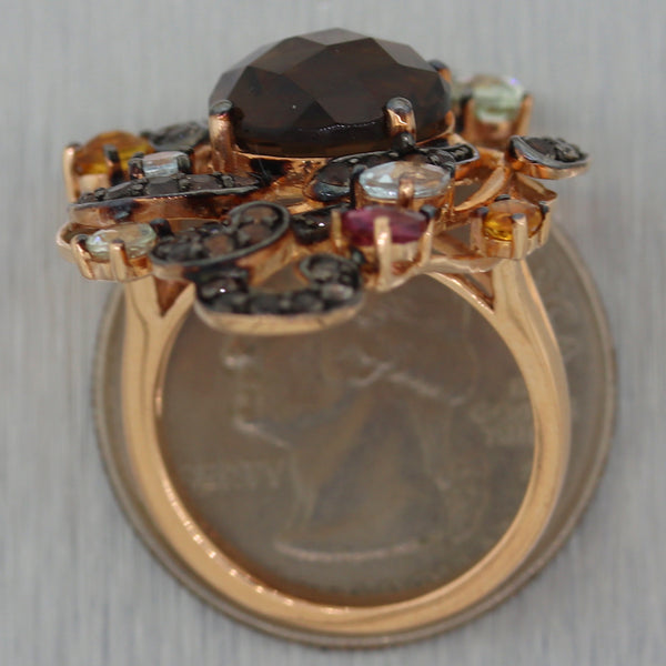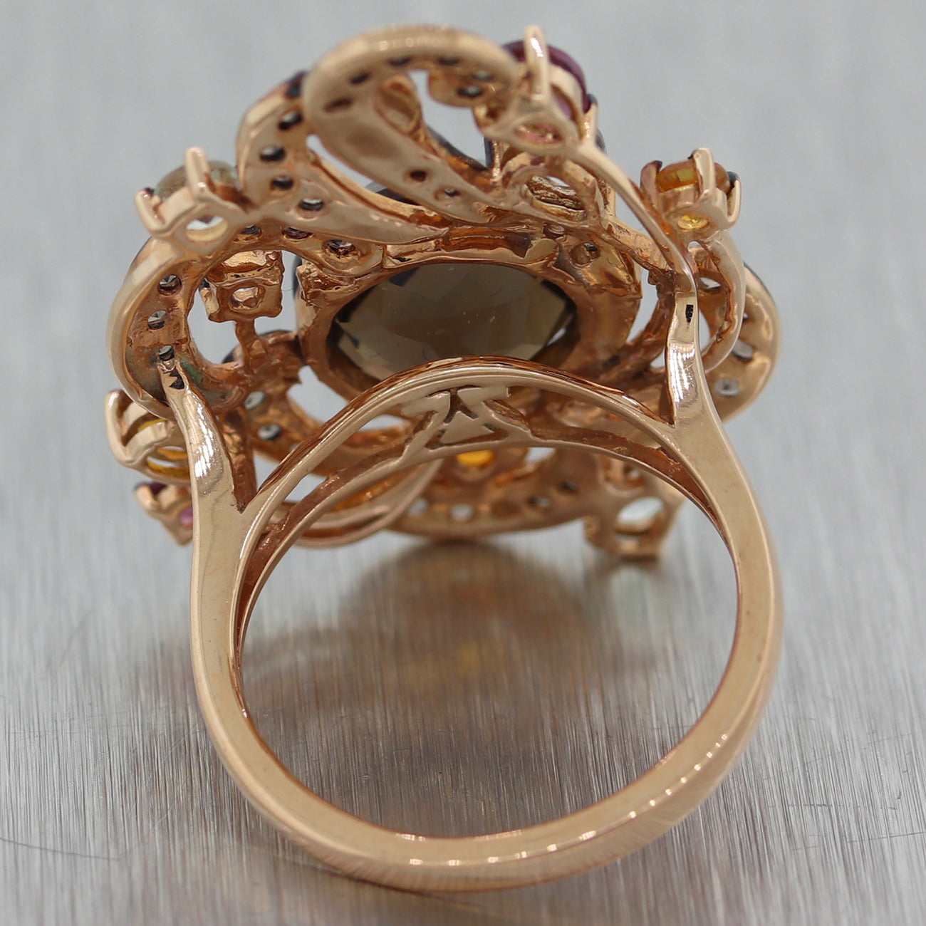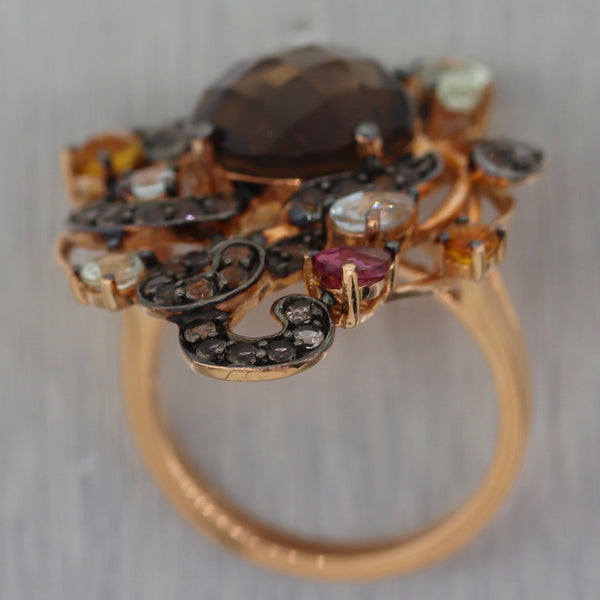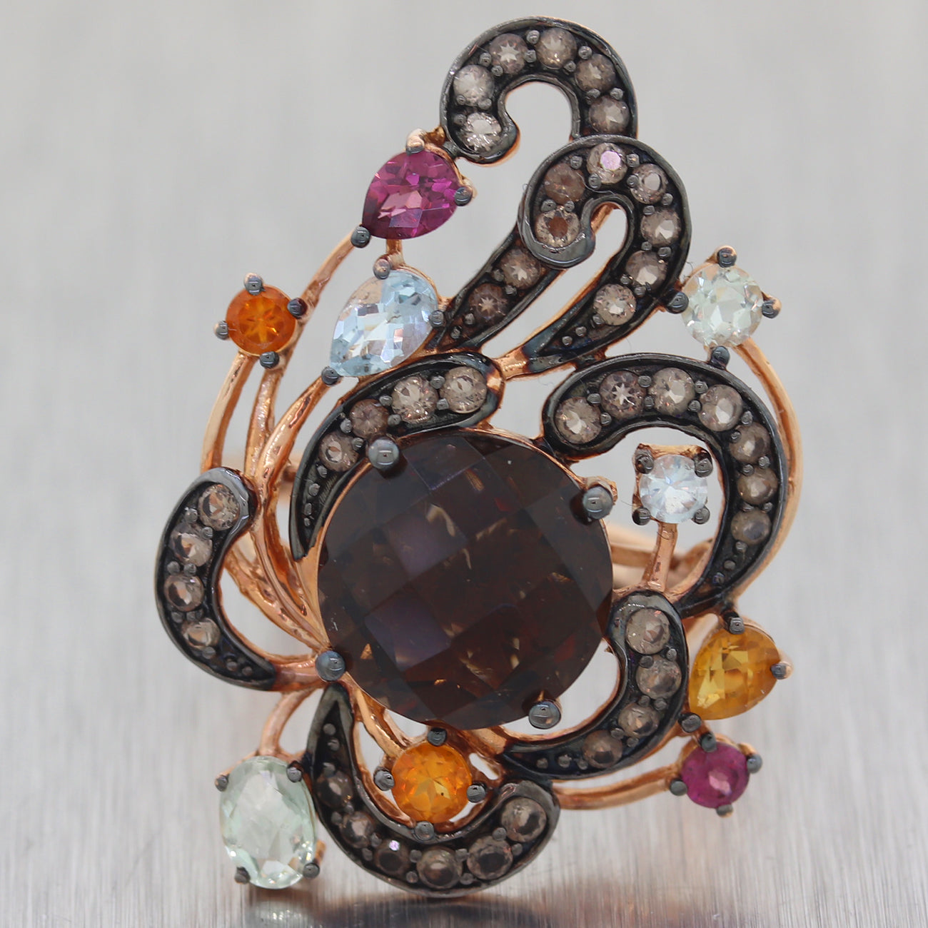 Diamond - (36) Round Cut - Chocolate - 1.00ctw (approx.) Quartz - (1) Round Cut - Brown - 4ctw (approx.) Tourmaline - (2) Round & Pear Cut - Red - 0.25ctw (approx.) Aquamarine - (4) Round & Pear & Oval Cut - Blue - 0.50ctw (approx.) Citrine - (3) Round & Pear Cut - Yellow - 0.25ctw (approx.) |