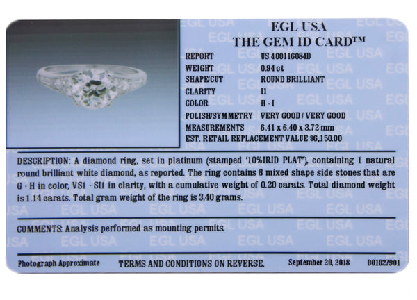 Lovely Ladies Platinum 0.94ct H-I I1 Round Brilliant Diamond Engagement Ring EGL
