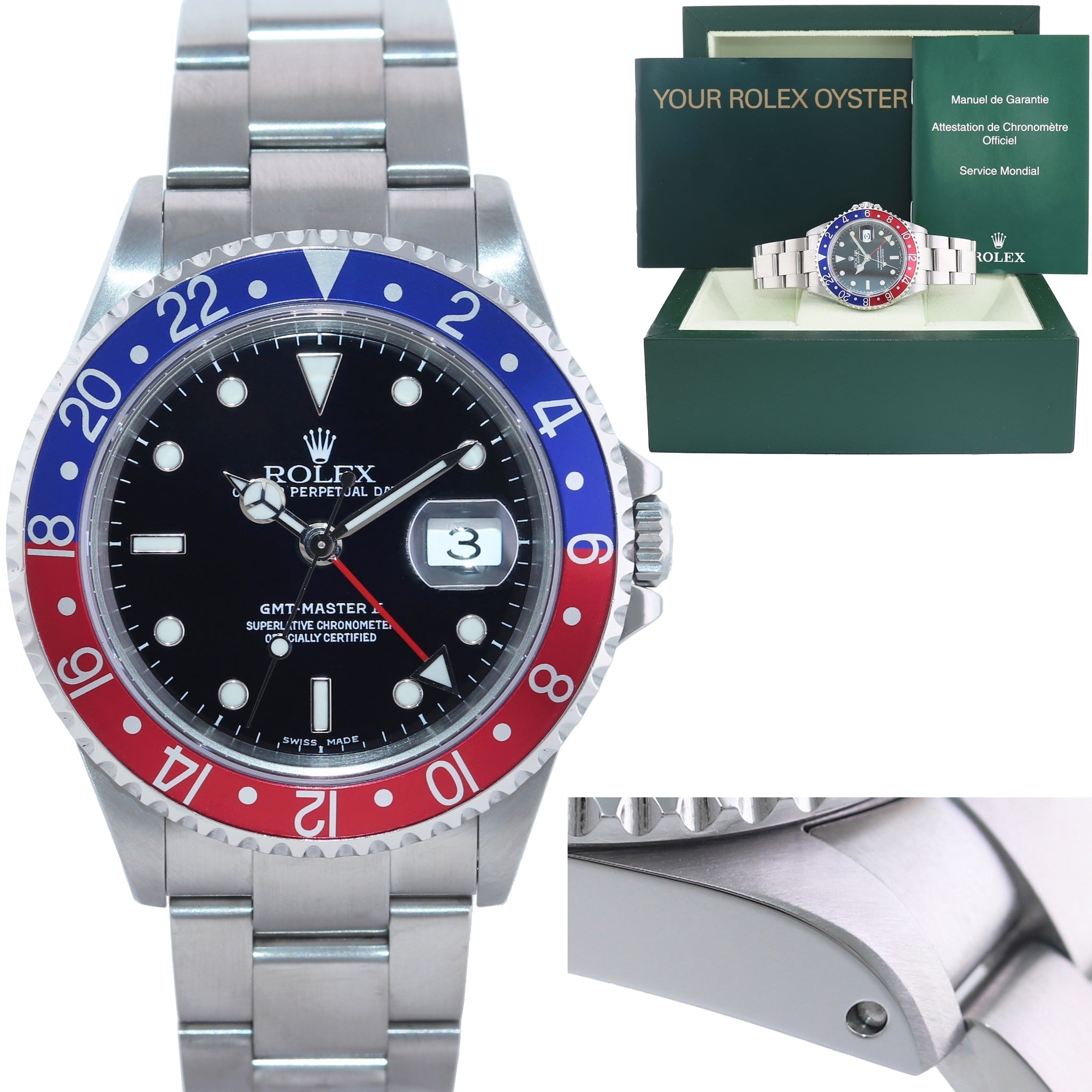 | Dial | Rolex Black Stick Index Dial with date at the 3 o'clock and a Red 24-hour GMT hand |
