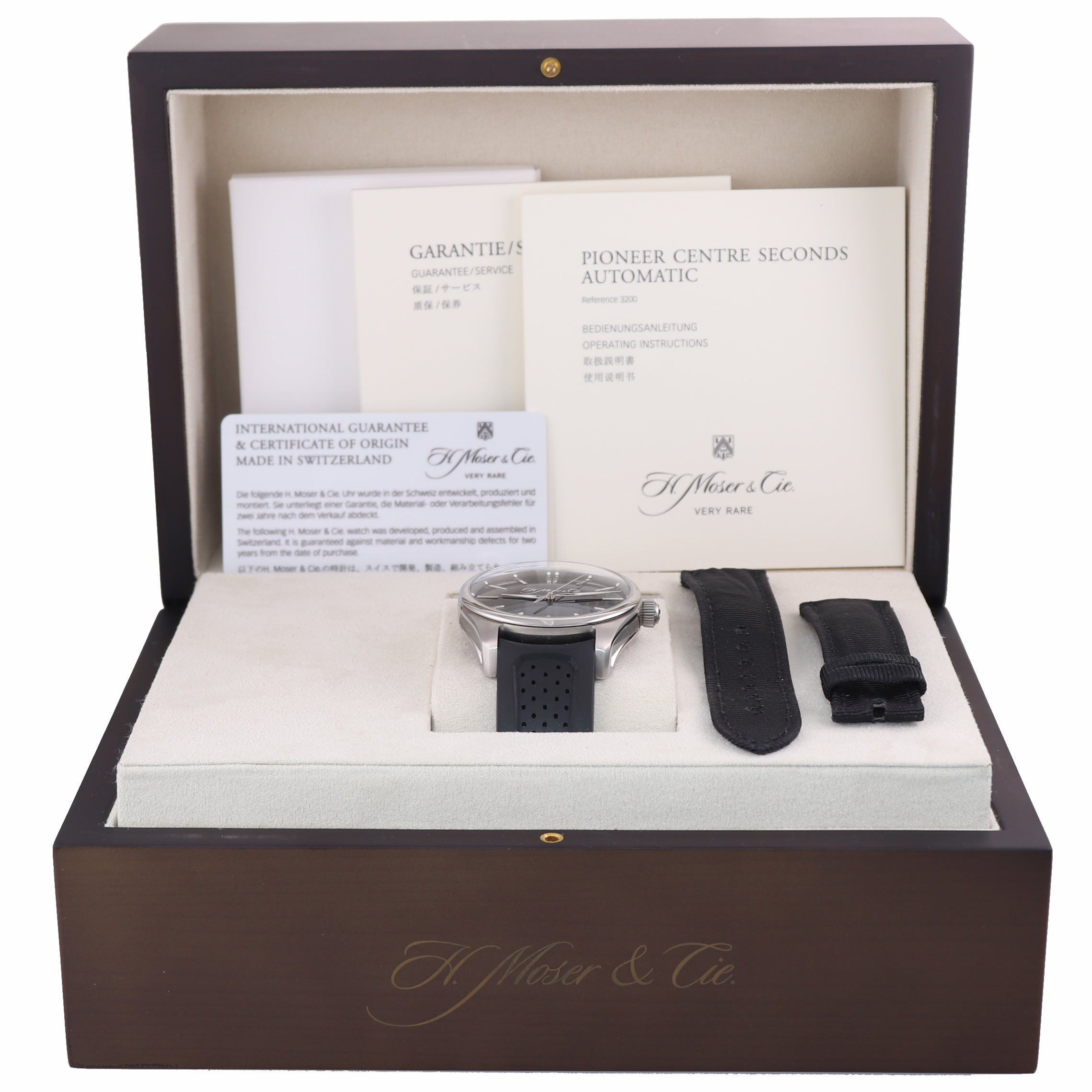 PAPERS H. Moser & Cie. Pioneer Centre 3200-1200 42mm Blue Fumè Steel Watch bOX