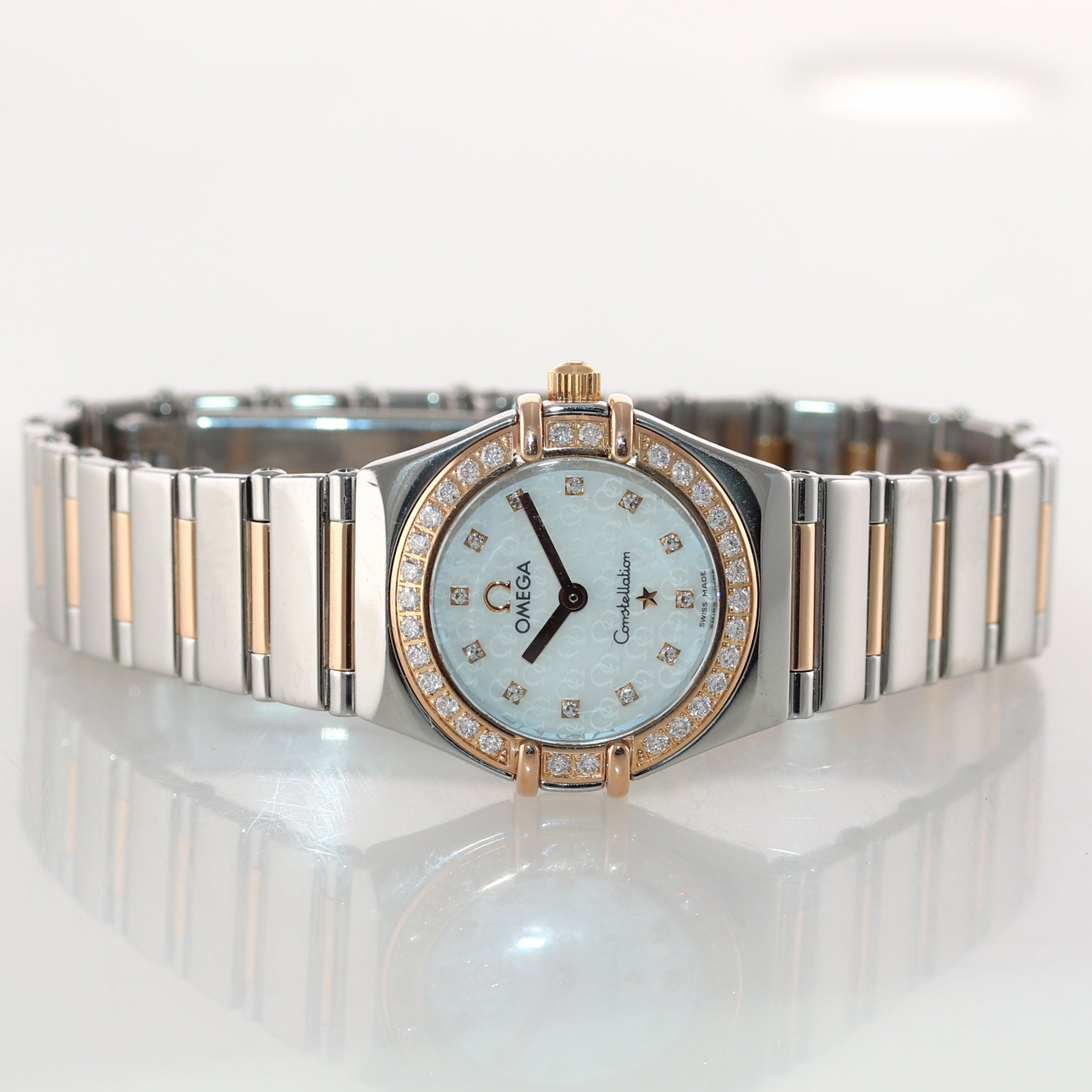 | Bezel | Original Omega 18k rose gold diamond bezel |