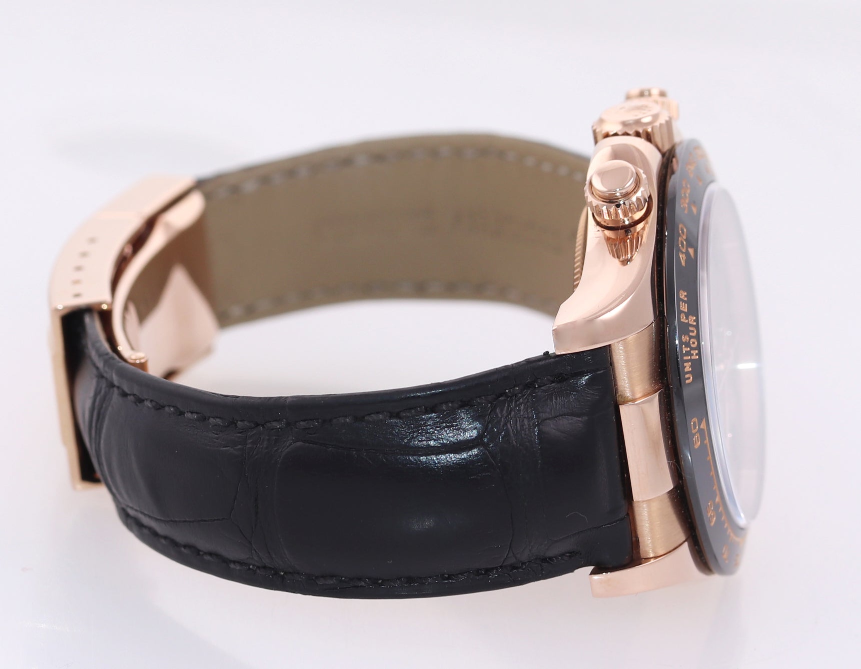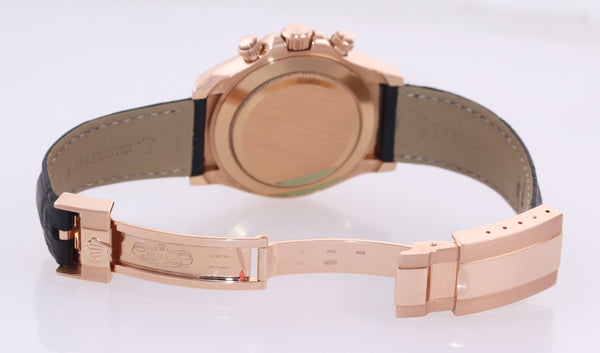 | Band | Original Rolex Black Leather Band Strap with Original Rolex 18K Rose Gold Flip Lock Deployment Clasp |