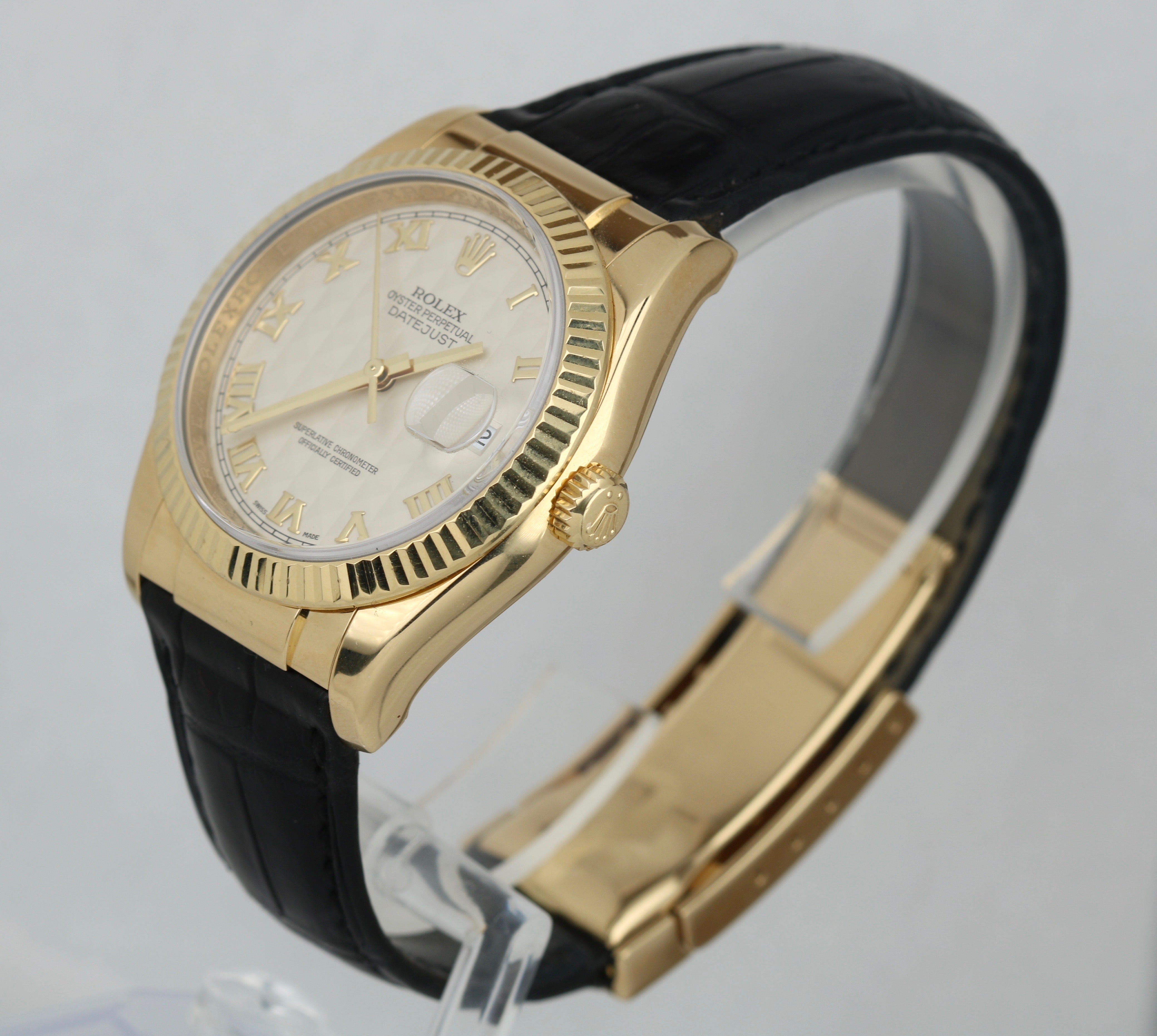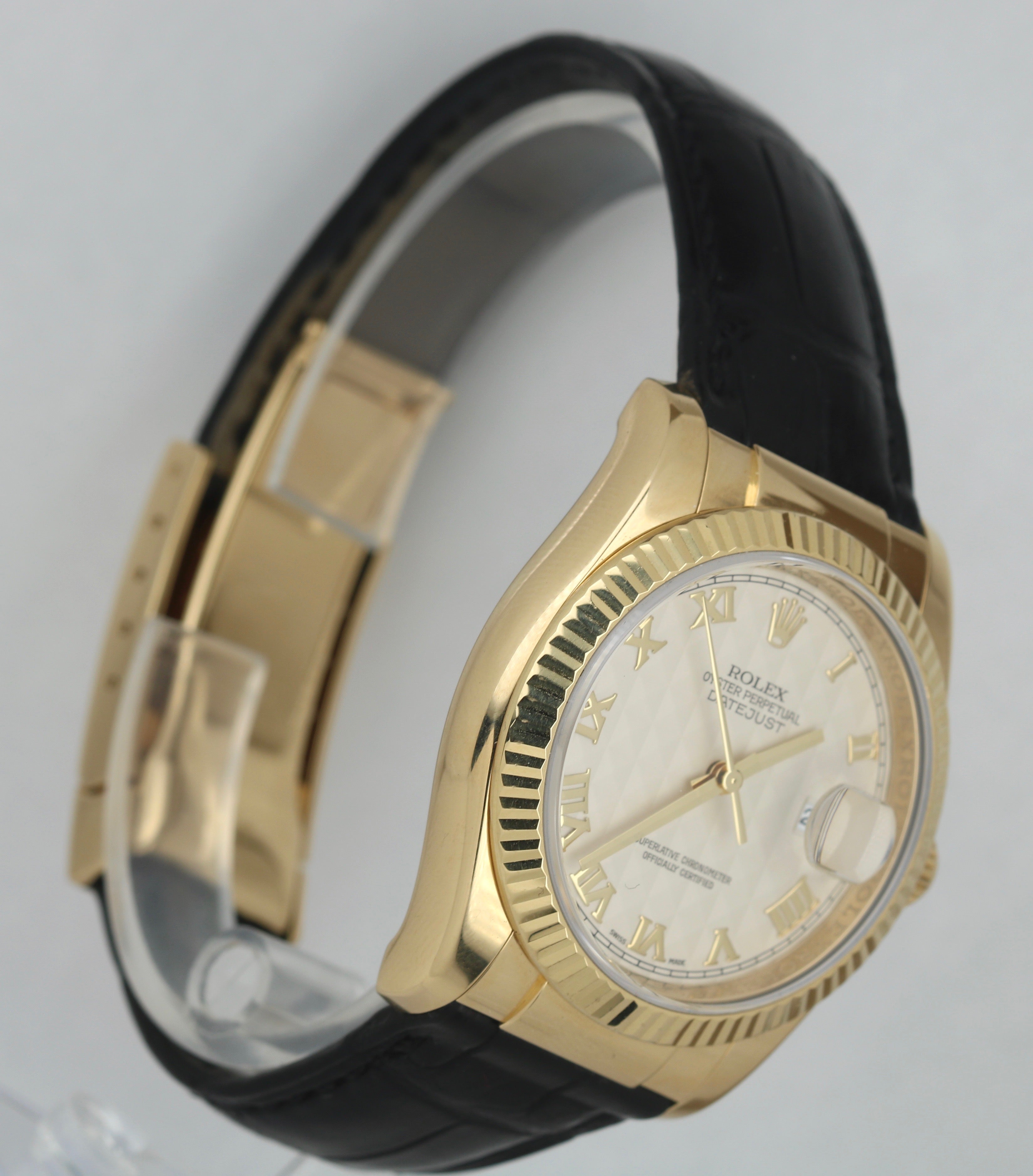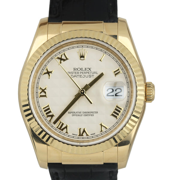 MINT Rolex DateJust 36mm 116138 Ivory Pyramid Dial 18K Yellow Gold Leather Watch