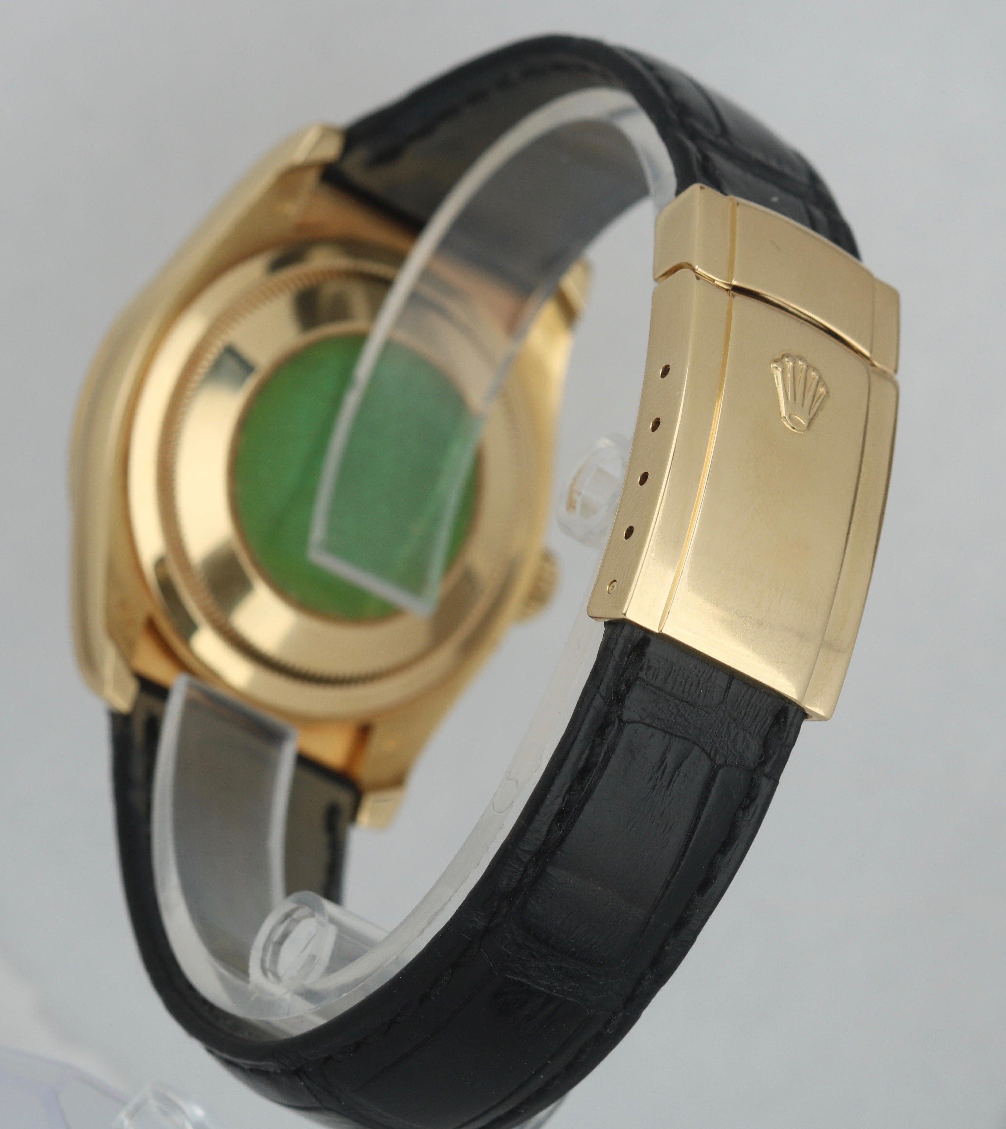 | Band | Original Rolex Black Leather Strap with an 18K Yellow Gold Folding Deployment Clasp |