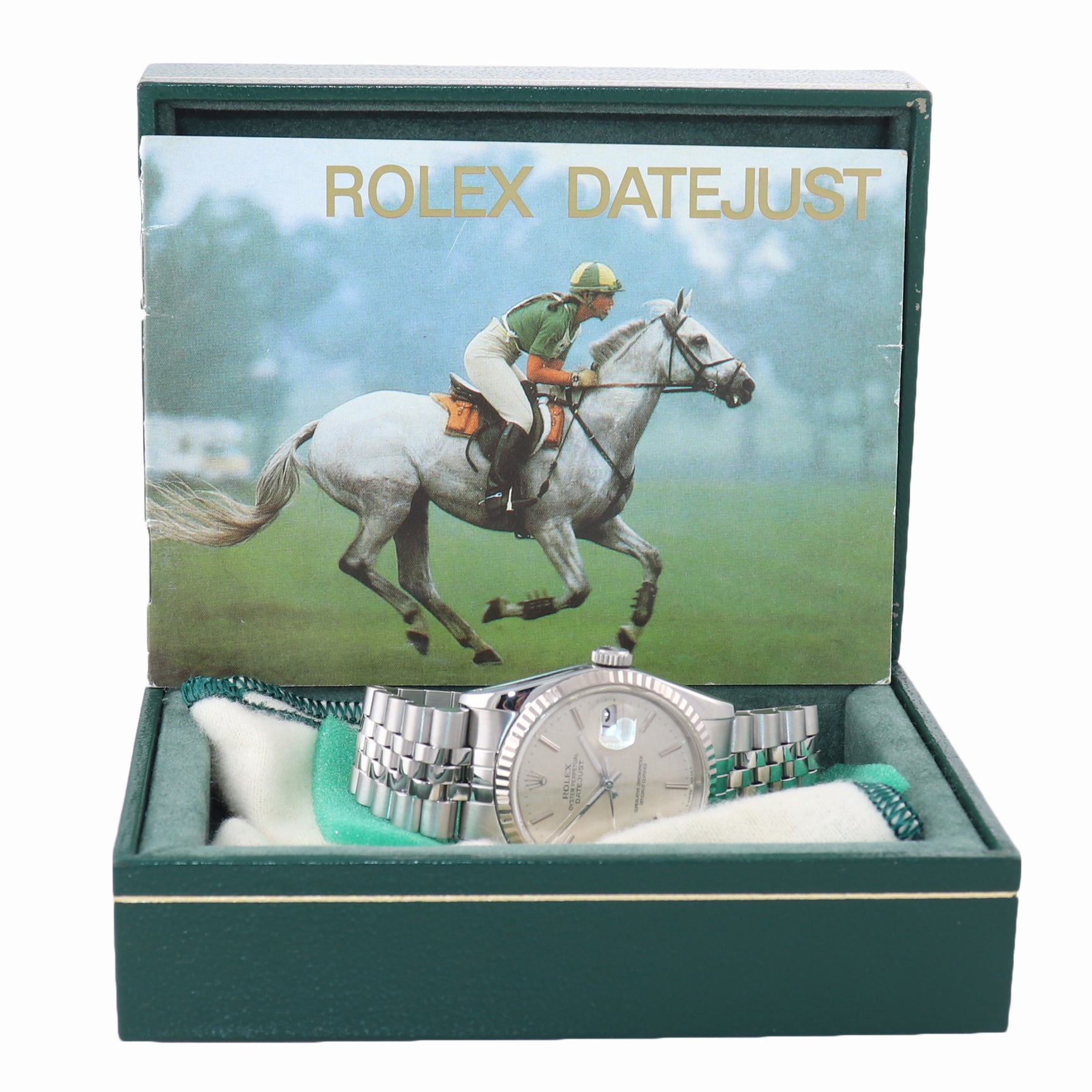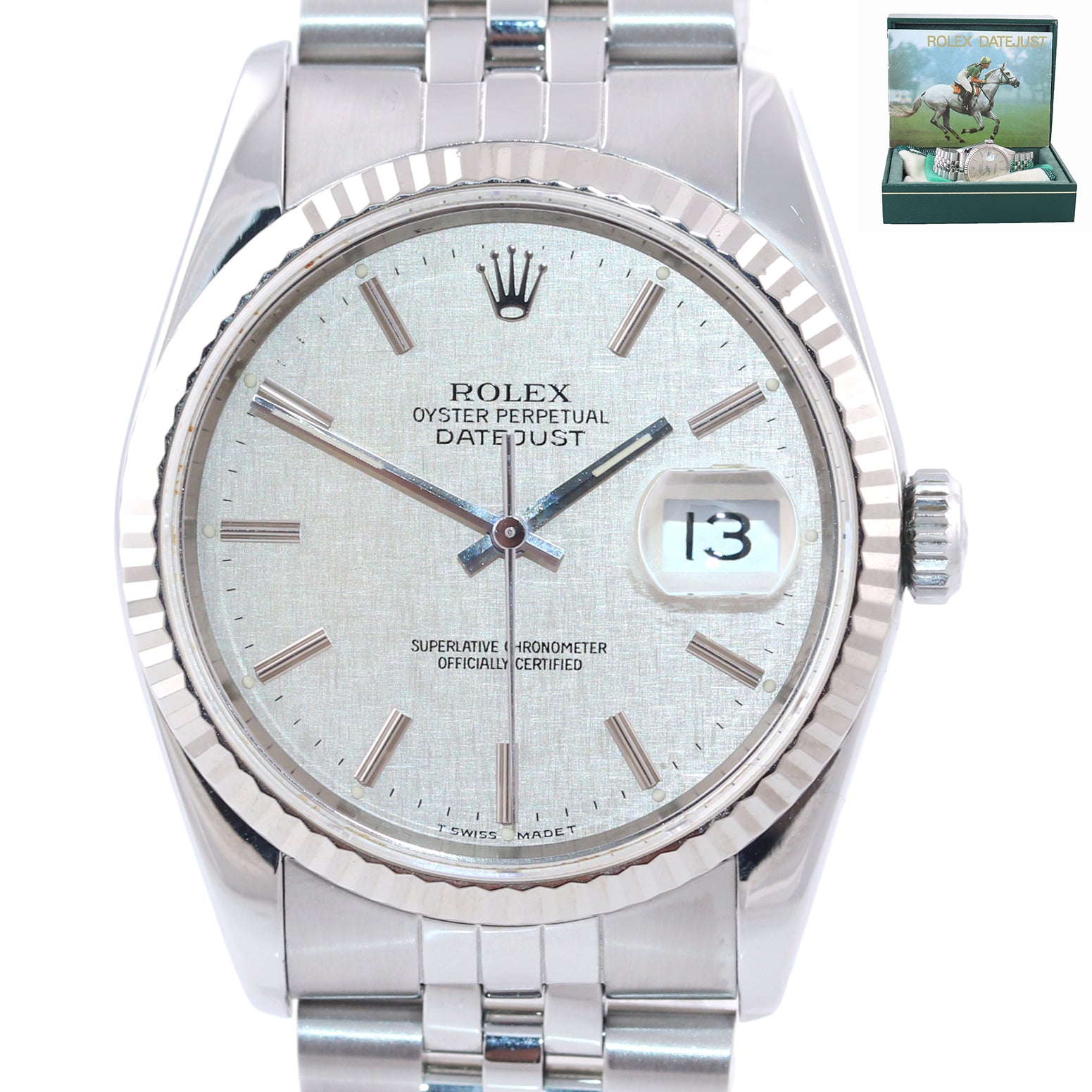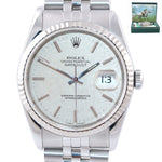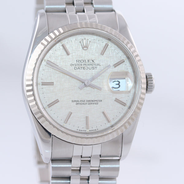 MINT Rolex DateJust 36mm 16234 Steel Silver Linen Jubilee 18k Fluted Bezel Watch