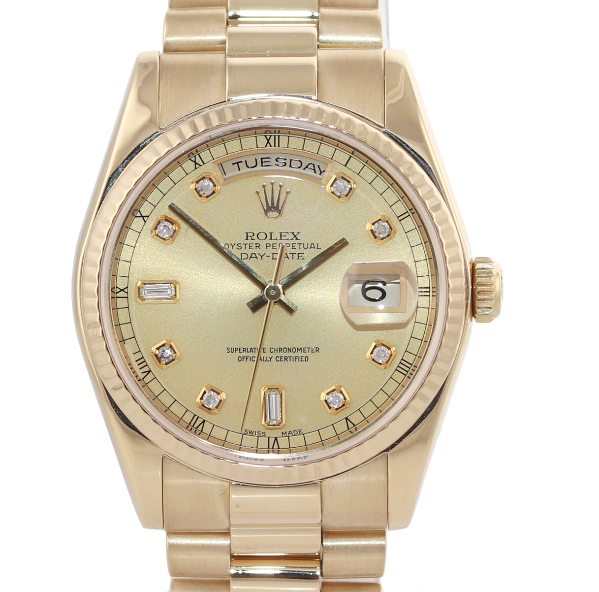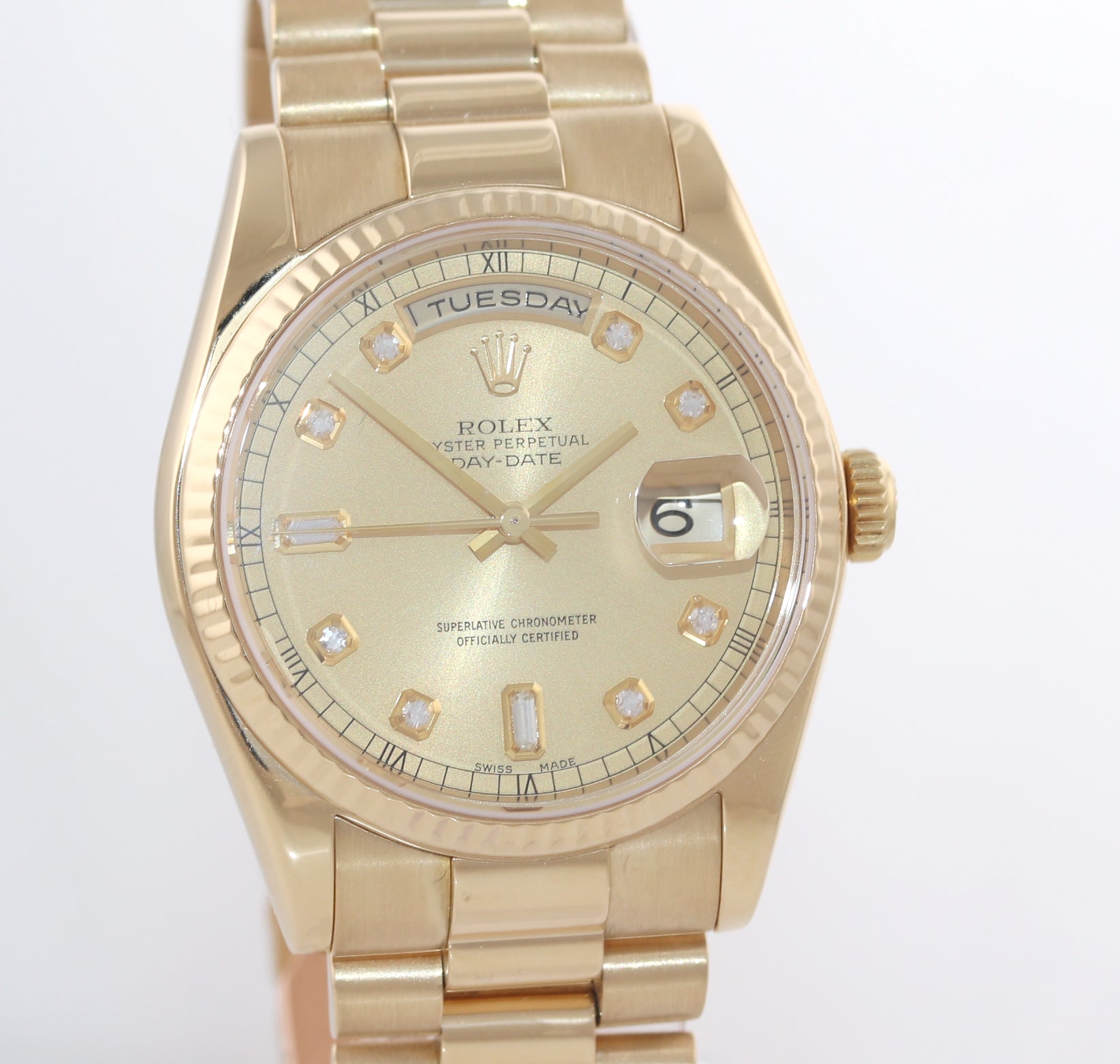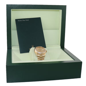 | Dial | ORIGINAL Rolex Factory Champagne Diamond Dial with the day at the 12 o'clock and the date at the 3 o'clock |