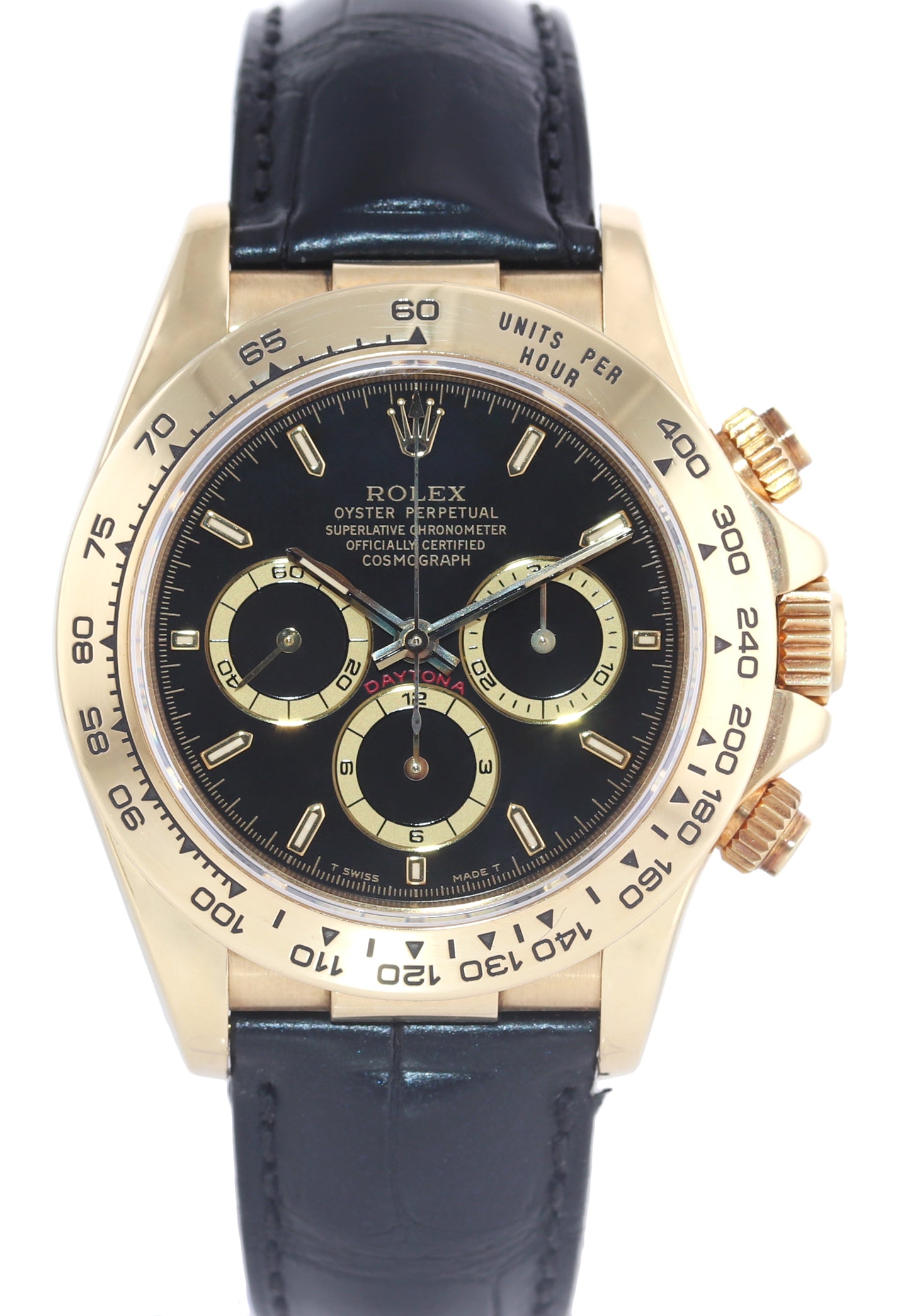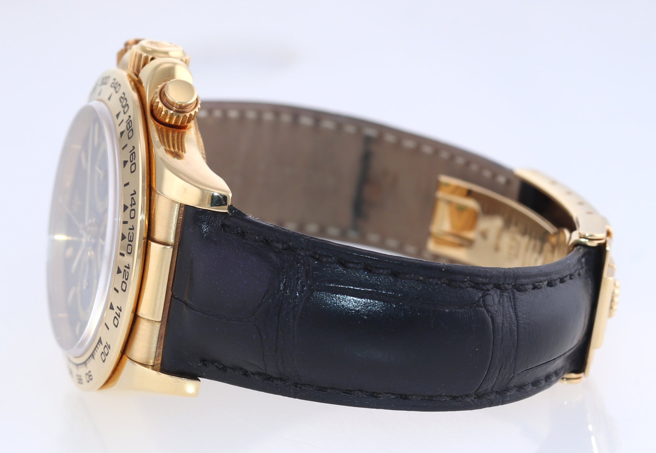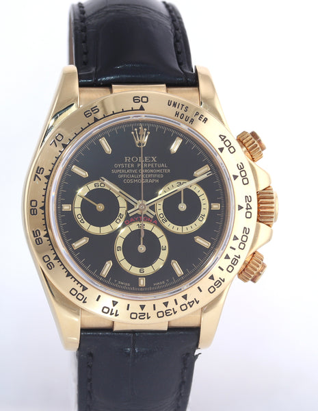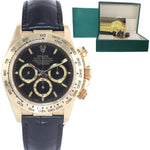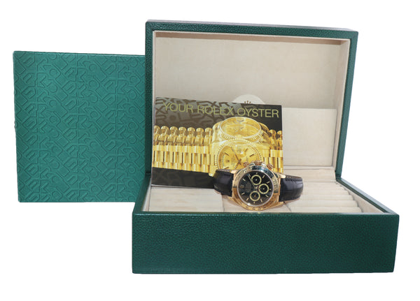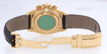 | Band | Rolex Genuine Black Leather Strap with its Rolex 18K Yellow Gold Flip Lock Deployment Clasp. |