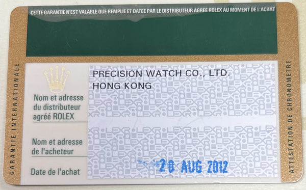 | Serial Number | Randomized Eight-Digit Serial (The Rolex warranty card is dated August of 2012 and is unnamed!) |
