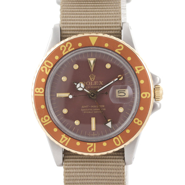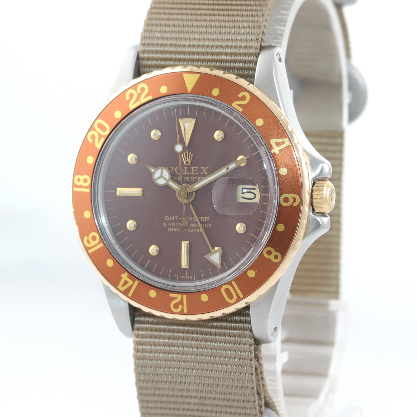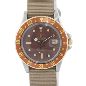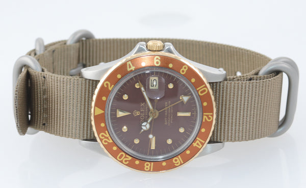 Rolex GMT-Master 1675 Two-Tone Gold Steel Brown Nipple Dial 40mm Watch.