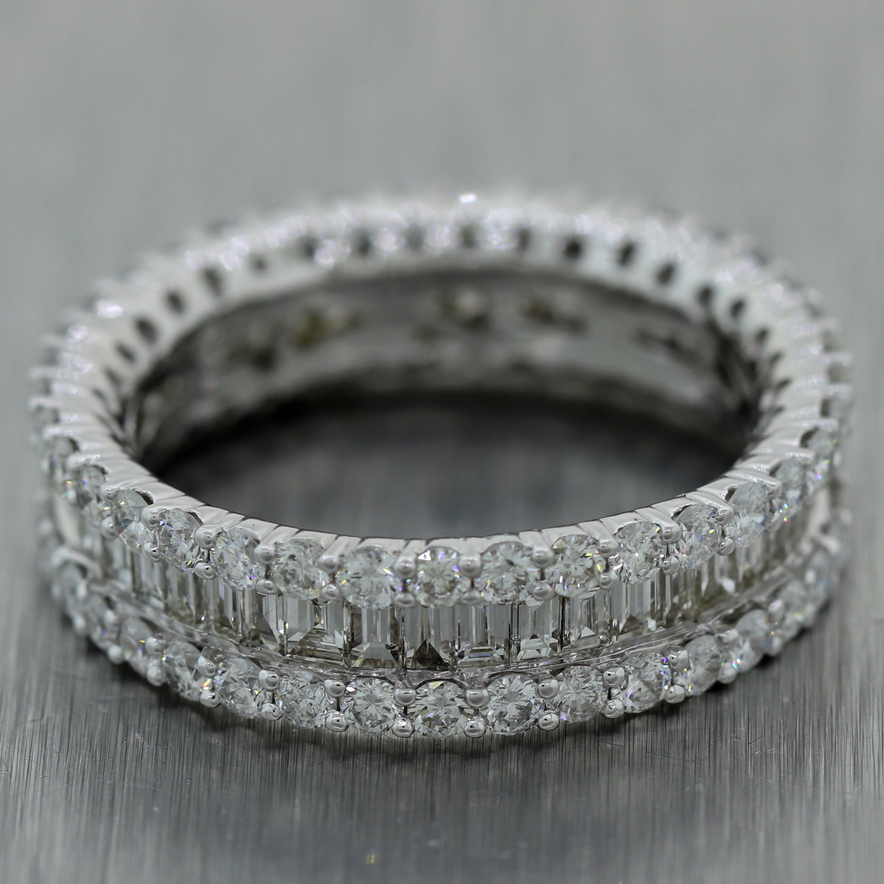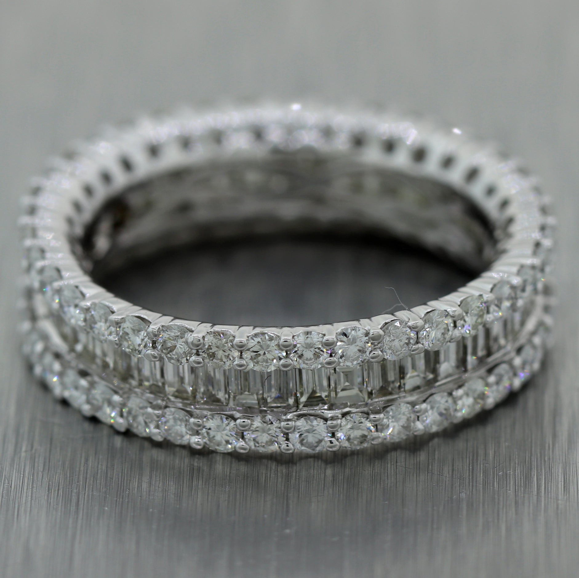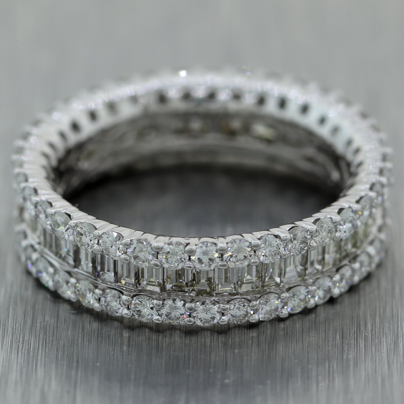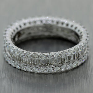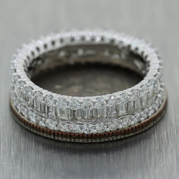 For your consideration, an authentic Modern 18k White Gold 2.25ctw Baguette & Round Cut Diamond Band Ring. This piece will come in a lovely ring box for a perfect presentation and our unconditional 30 day money back return policy. A1
