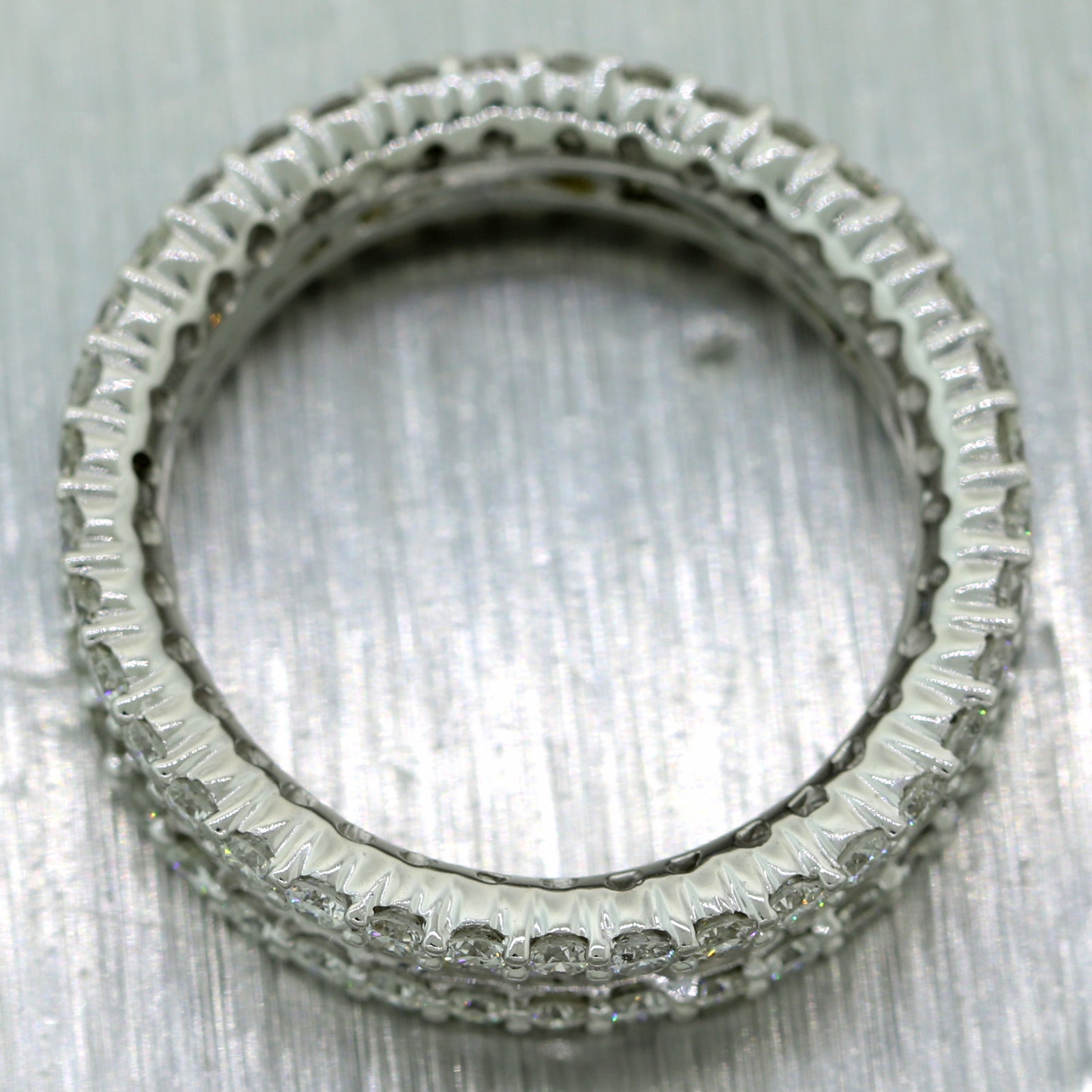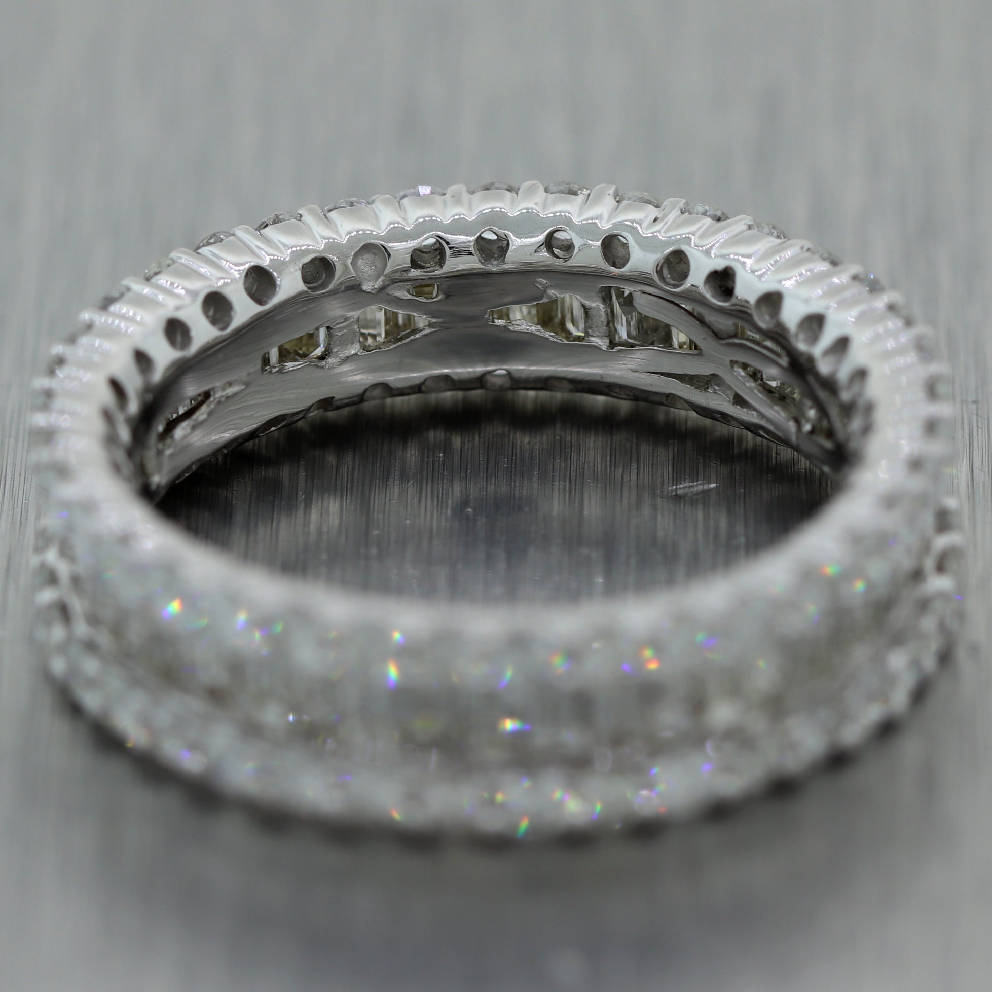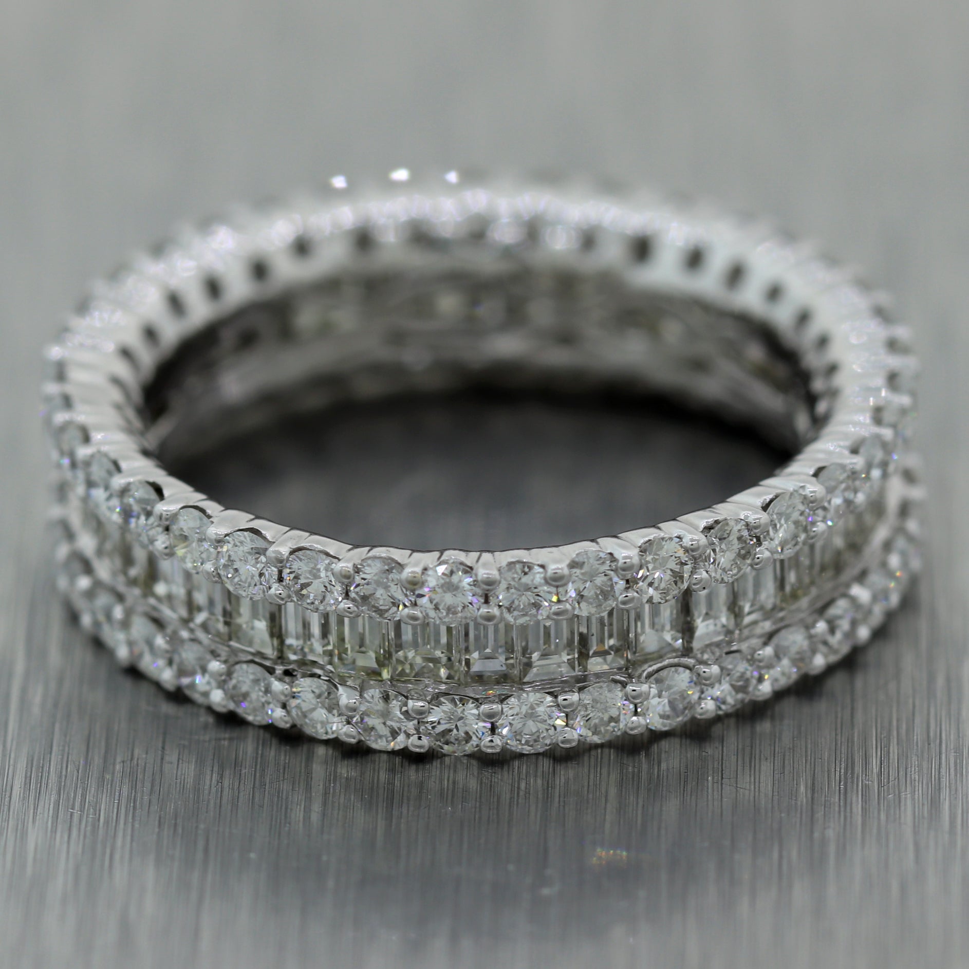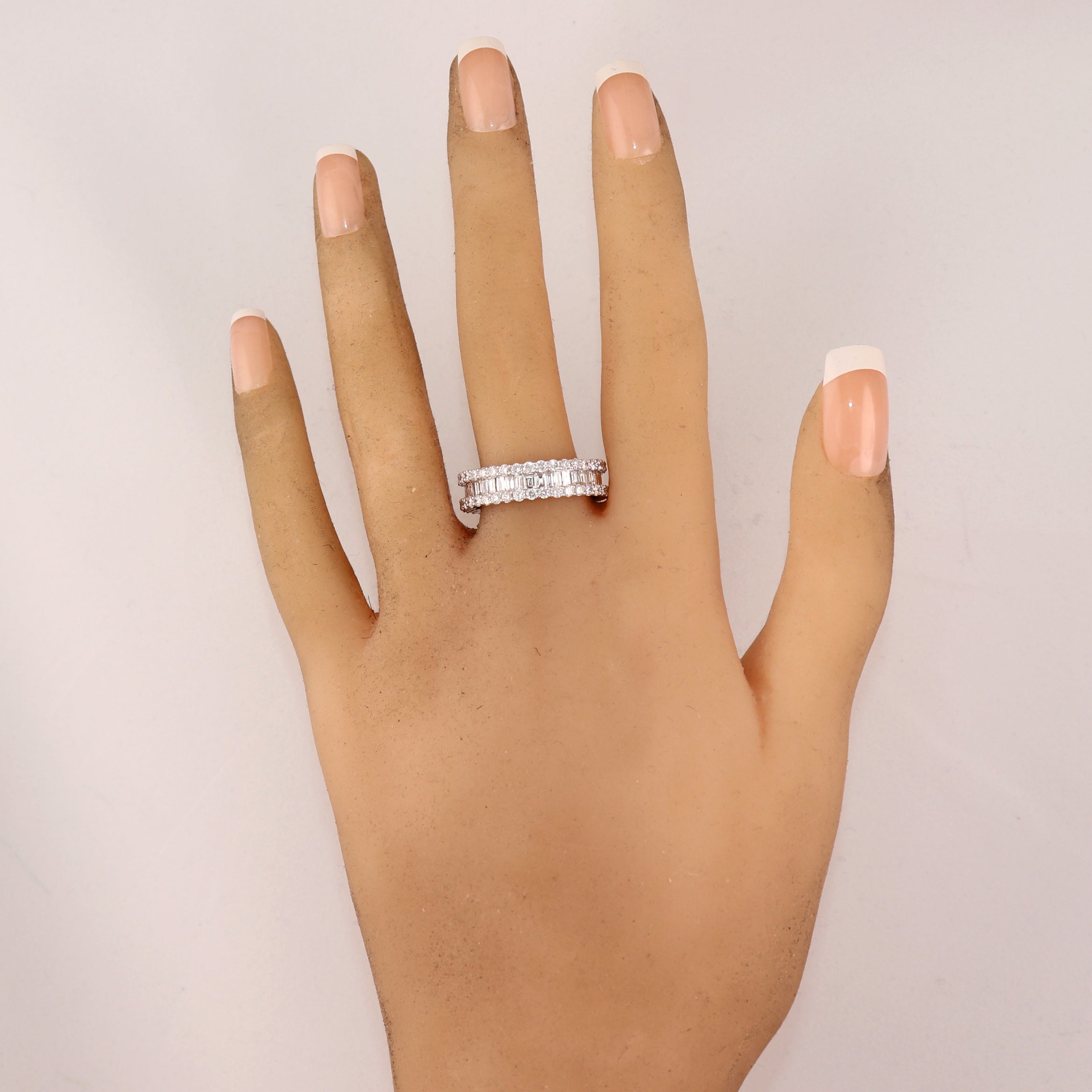 For your consideration, an authentic Modern 18k White Gold 2.25ctw Baguette & Round Cut Diamond Band Ring. This piece will come in a lovely ring box for a perfect presentation and our unconditional 30 day money back return policy. A1