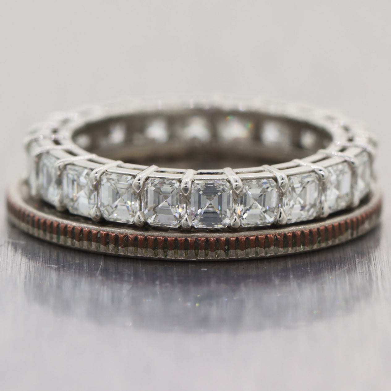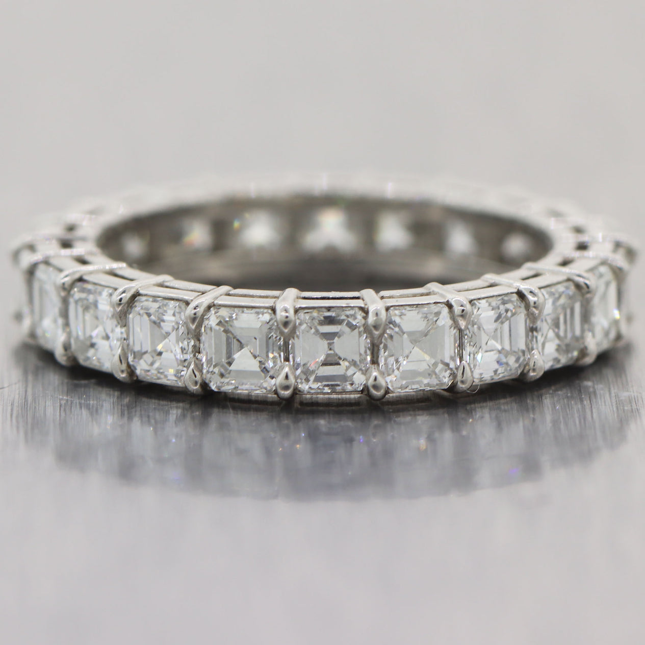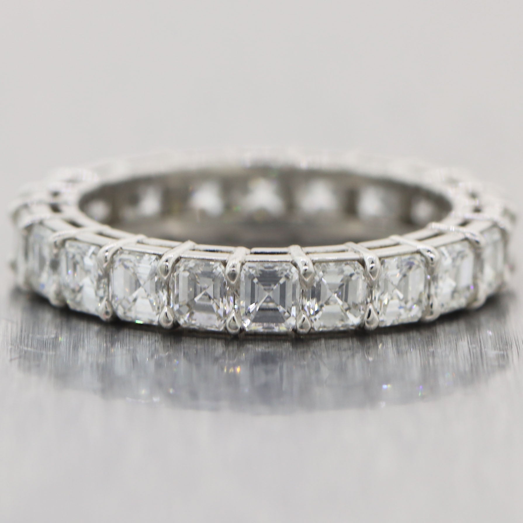 For your consideration, an authentic Modern Platinum 3.27ctw Ascher Cut Diamond Wedding Band Ring. It will come in a lovely ring box for a perfect presentation and our unconditional 30 day money back return policy. I9