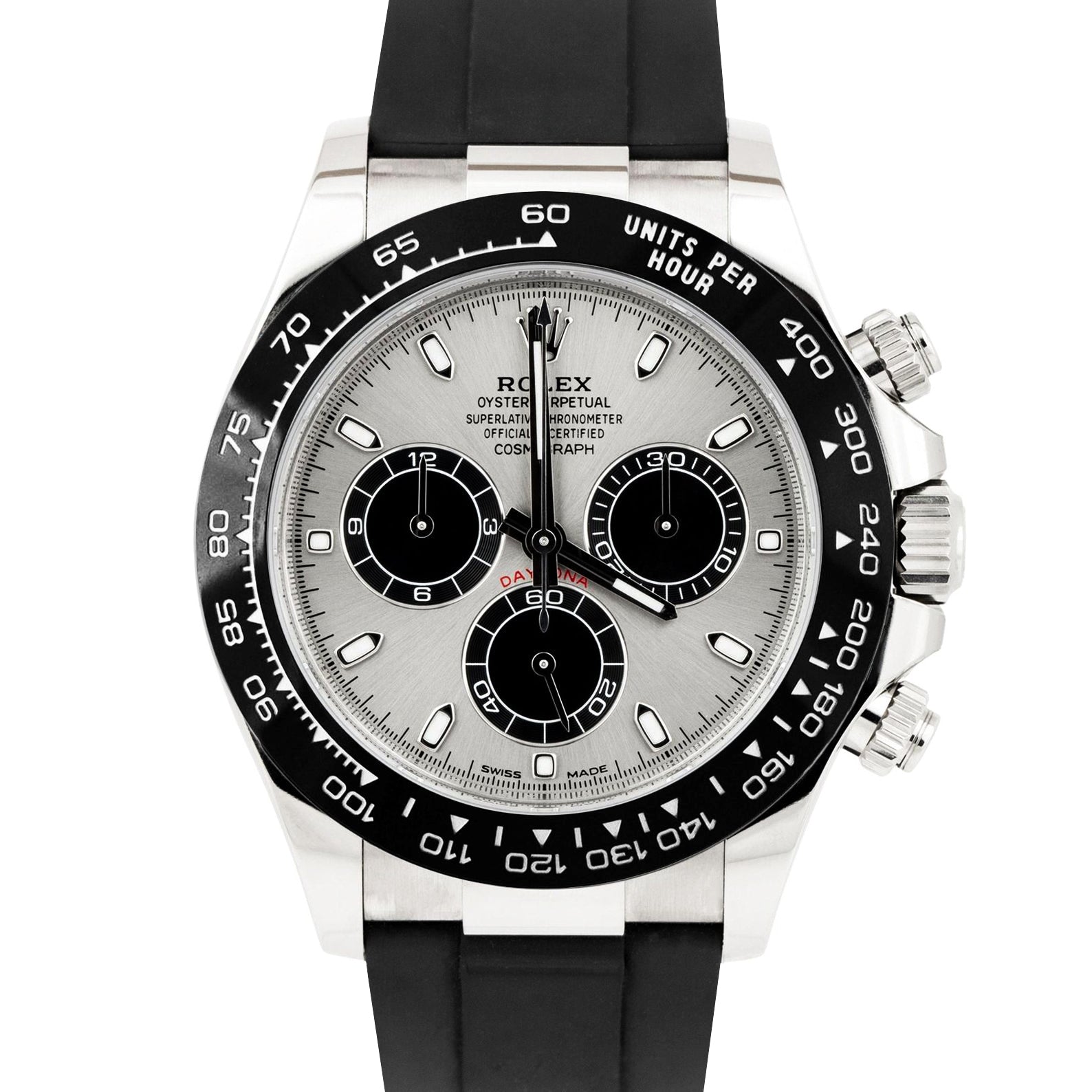 | Band | Black Rubber 'Oysterflex' Band with an 18K White Gold Flip Lock Deployment Clasp |