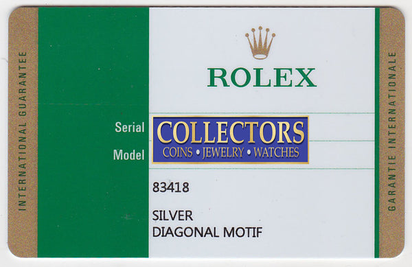 | Papers | Yes, this item will include the ORIGINAL ROLEX WARRANTY CARD & a Collectors Coins & Jewelry certificate of appraisal and authenticity as per buyer request. |