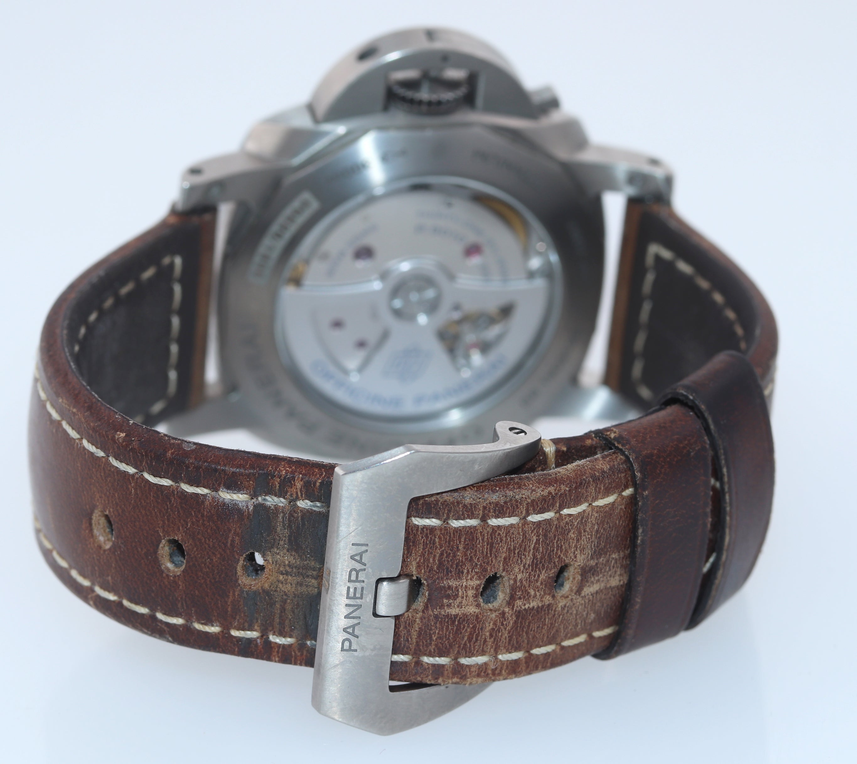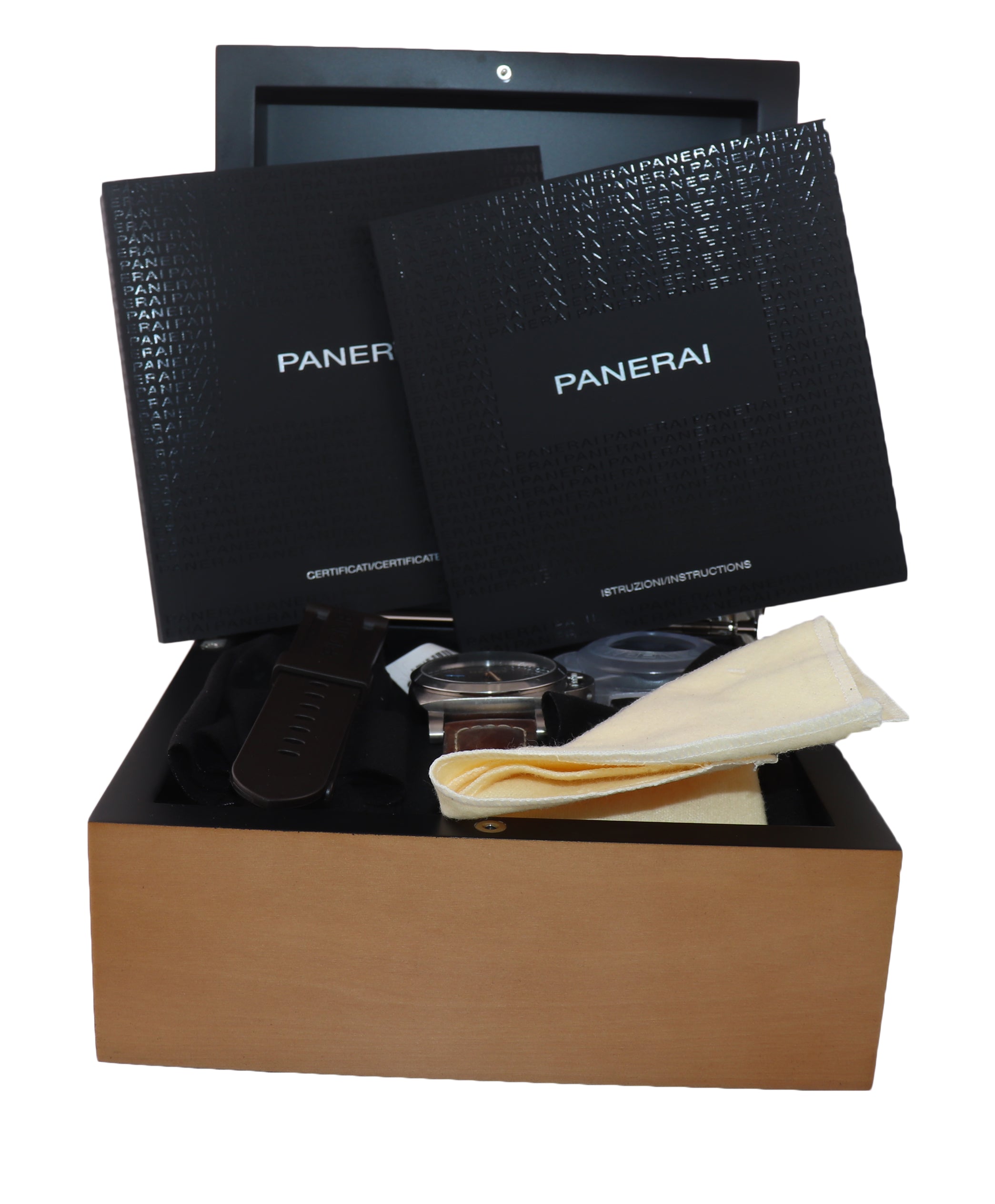 | Band | Original Panerai Brown Leather Strap with a Titanium Tang Buckle. |