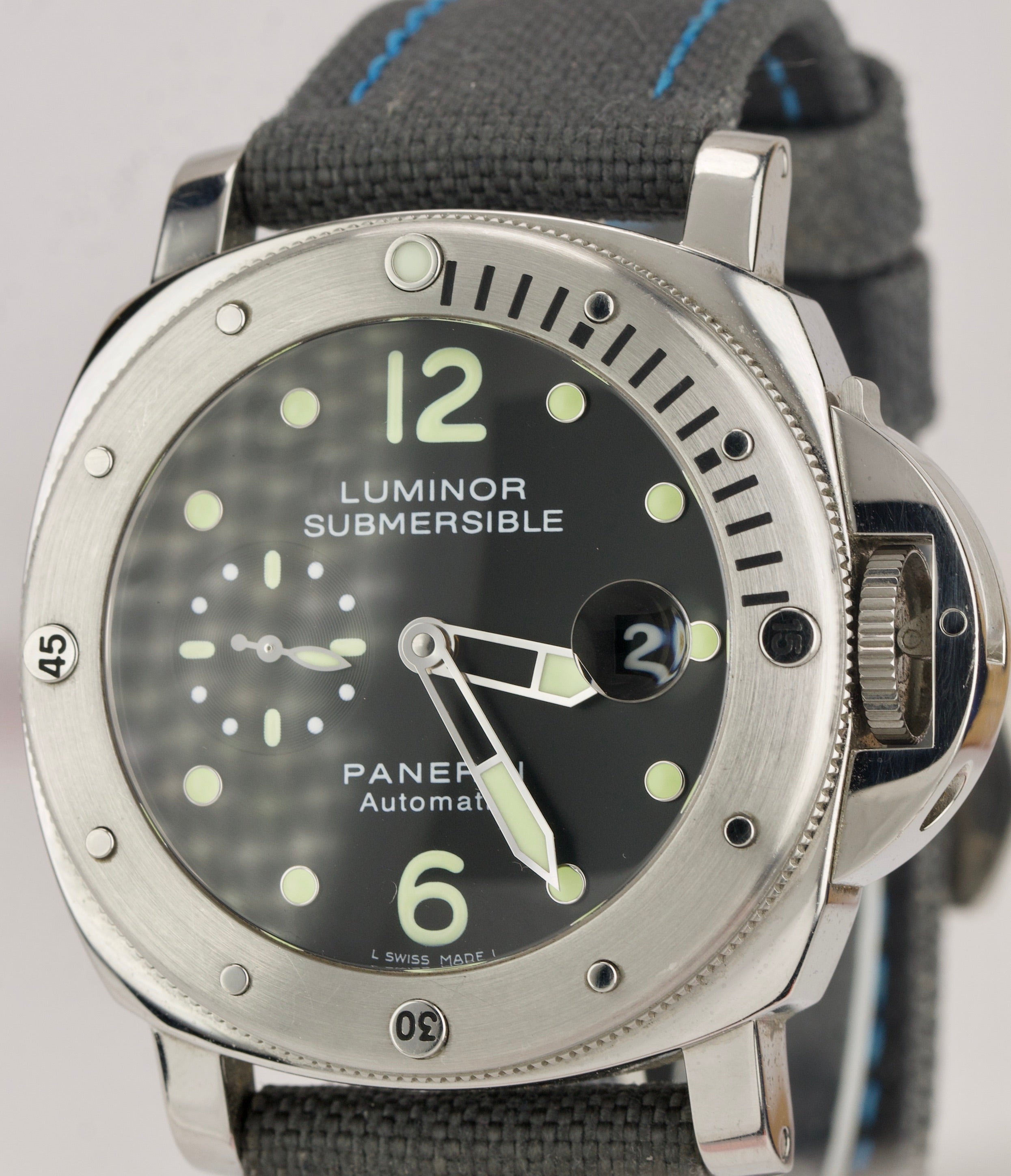 | Band | Original Panerai Grey / Blue Threated Canbas Strap with a Stainless Steel Tang Buckle. |