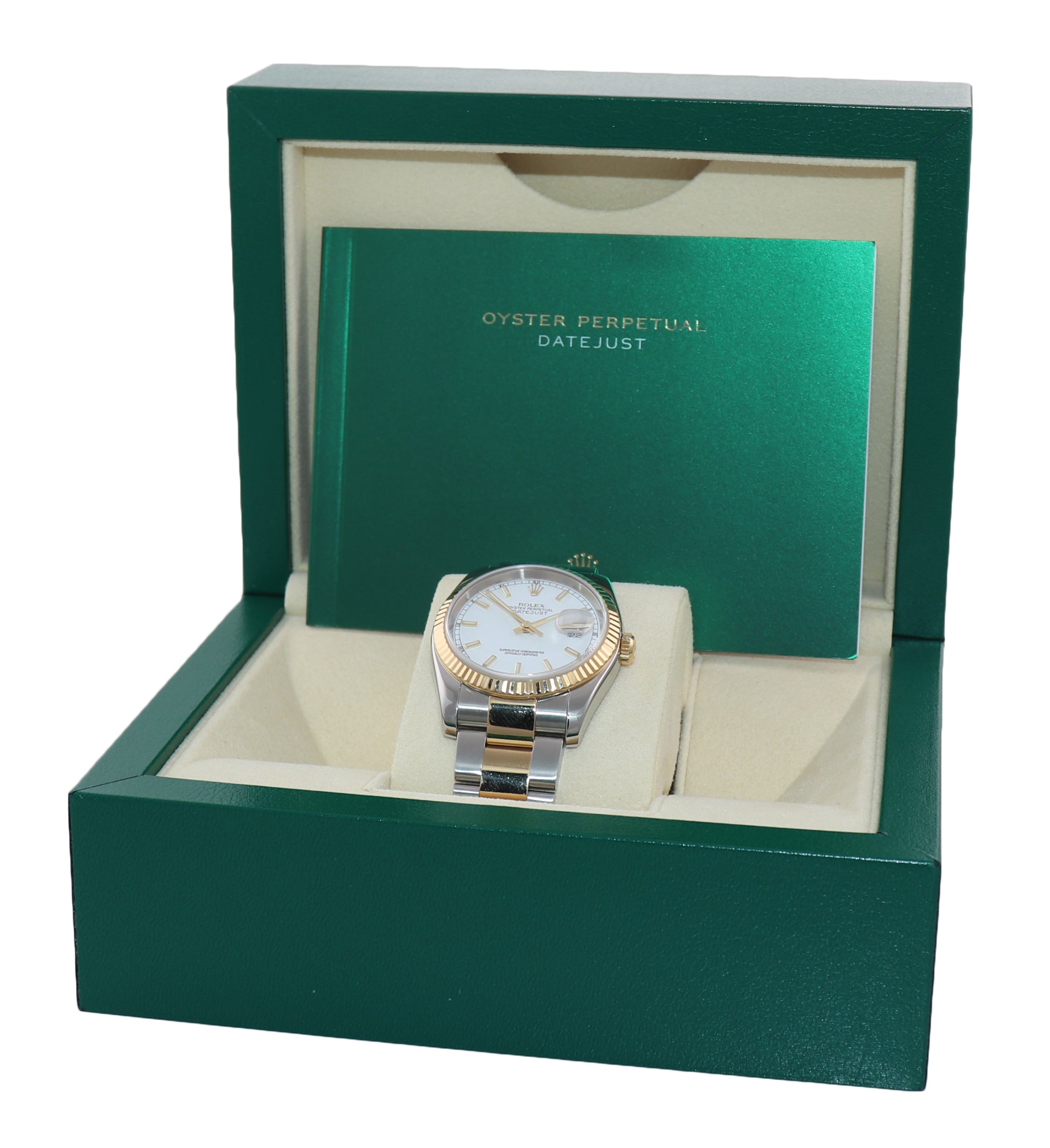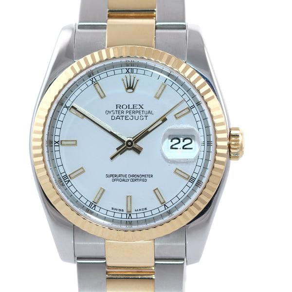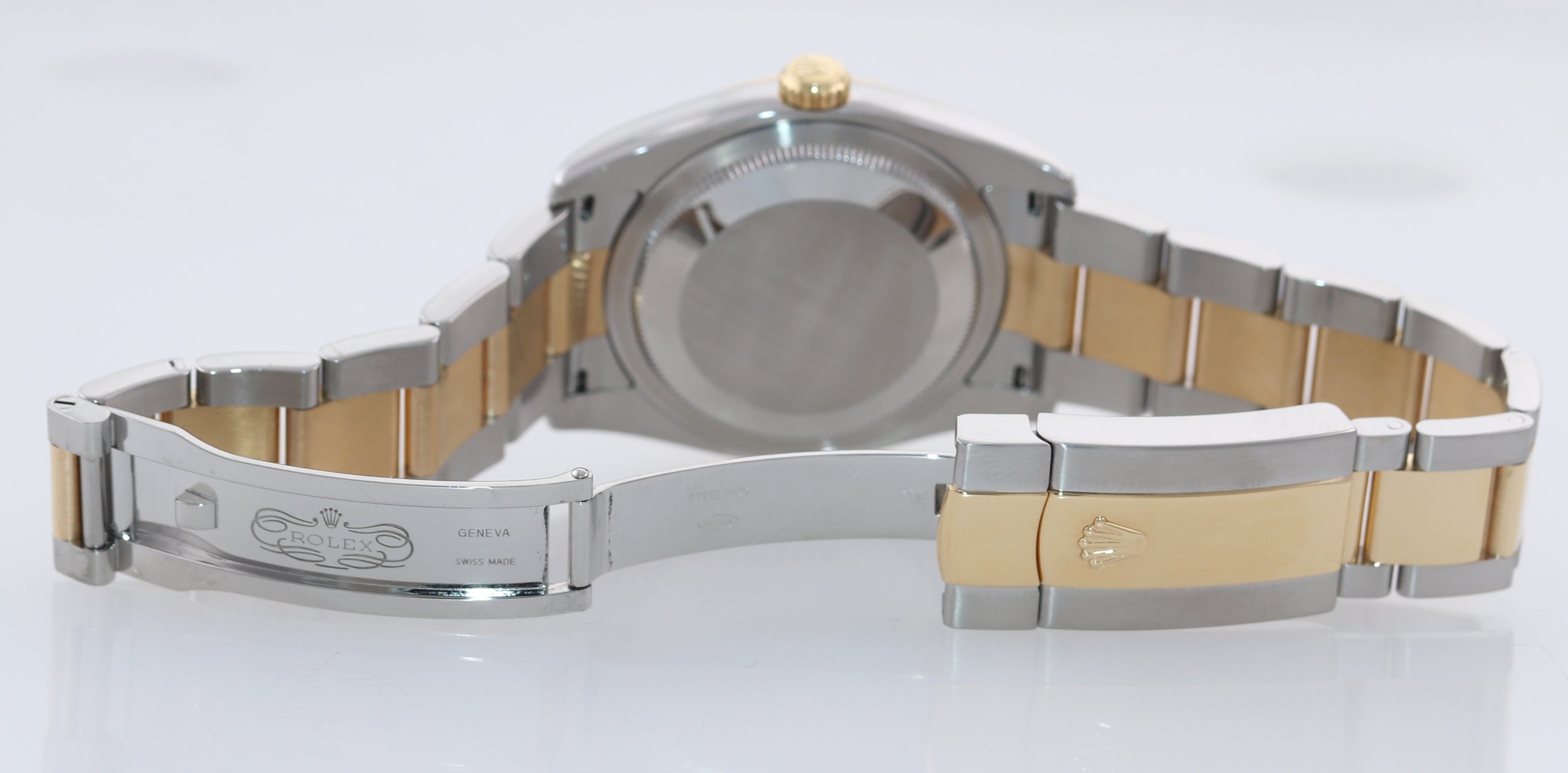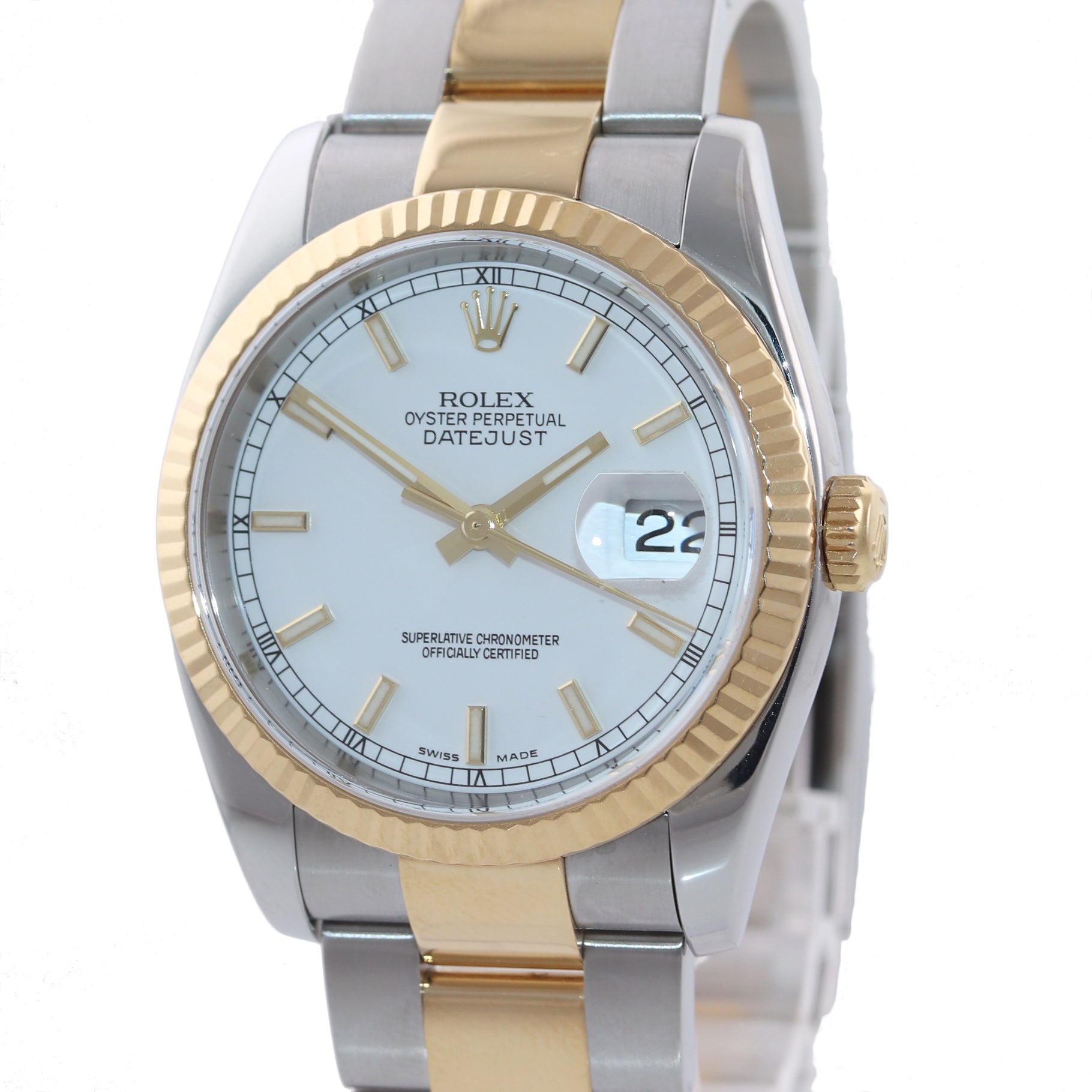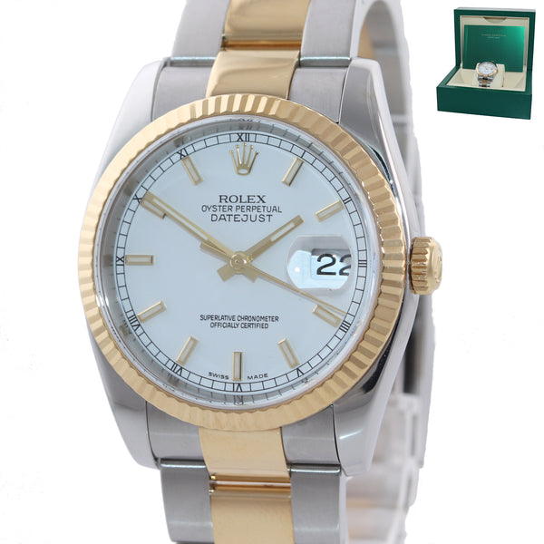 MINT Rolex DateJust 36mm White Stick 116233 18k Two Tone Gold Oyster Watch Box