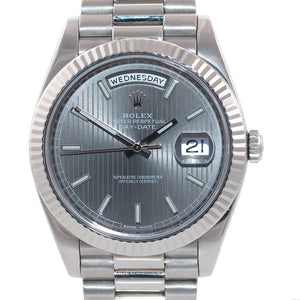 | Dial | Original Rolex Rhodium Tapestry Dial with the day at the 12 o'clock and the date at the 3 o'clock |