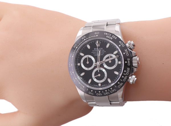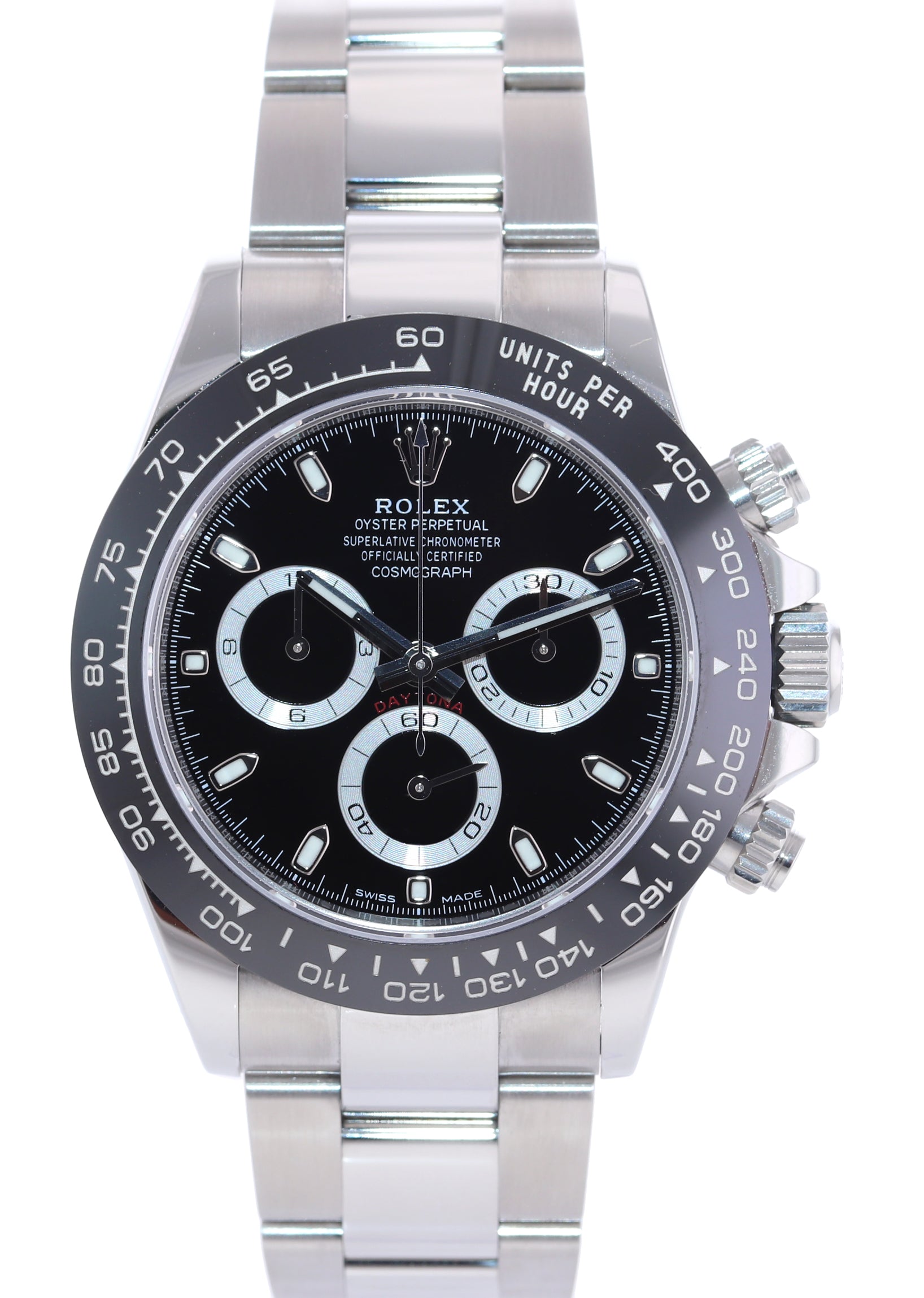 | Bezel | Rolex Fixed Black Ceramic Bezel with an engraved tachymetric scale |