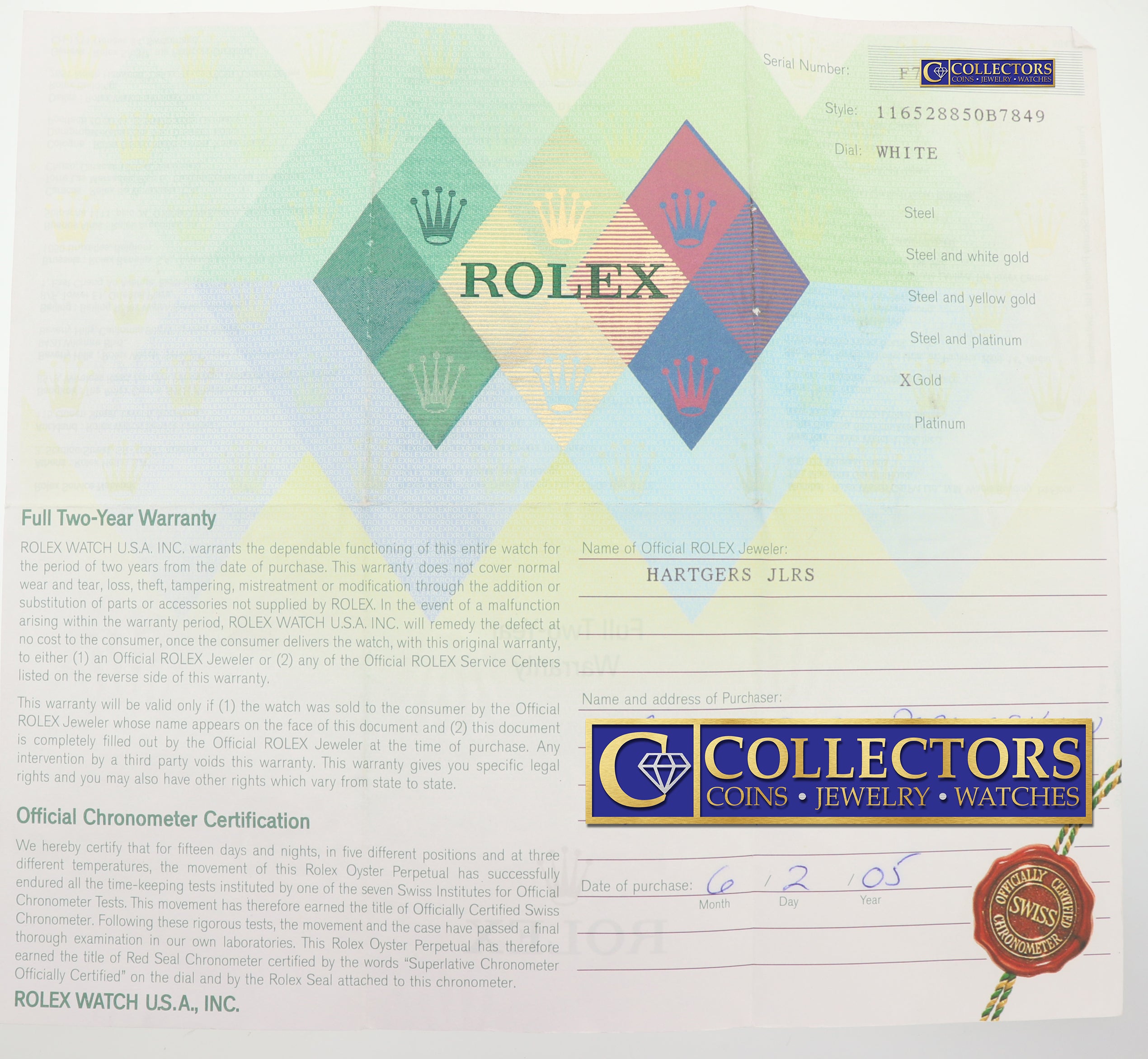 | Papers | Yes, this item will include its Original Rolex Warranty Papers & a Collectors Coins & Jewelry certificate of appraisal and authenticity as per buyer request. |