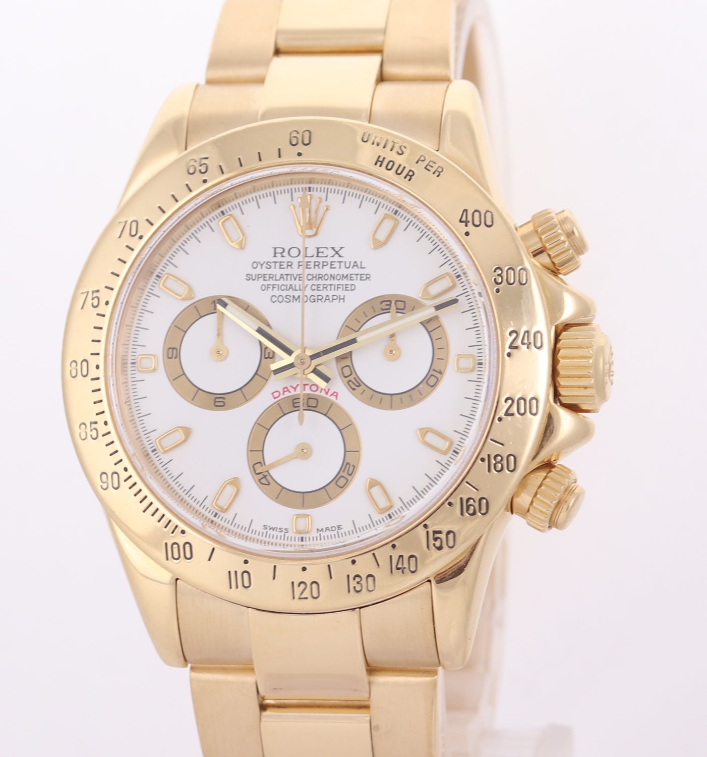 | Bezel | Original Rolex 18K Yellow Gold Bezel with an engraved tachymetric scale. Light wear from use. |