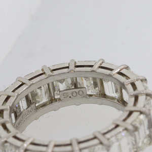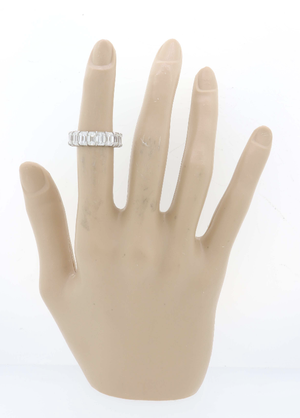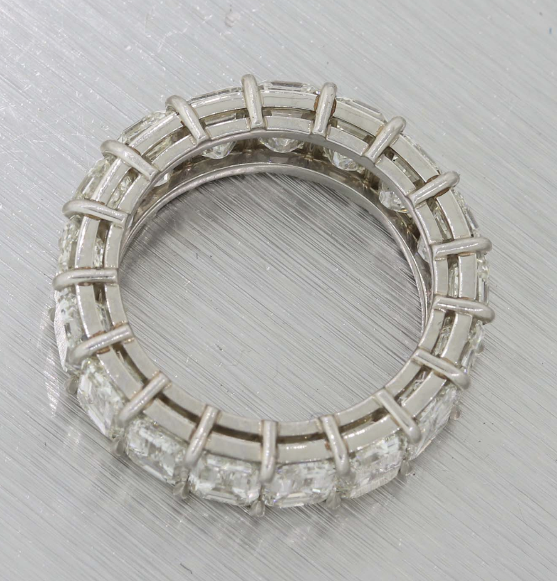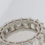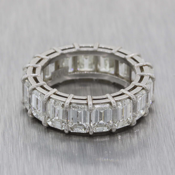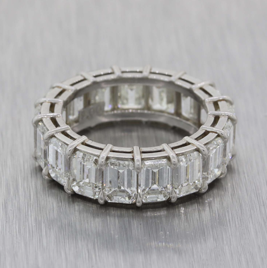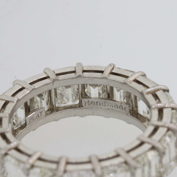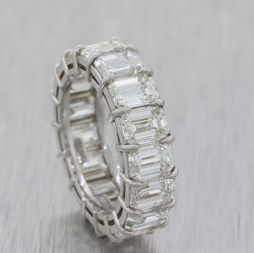 For your consideration, an authentic Platinum 9.00ctw Graduated Emerald Shape Diamond Eternity Wedding Band Ring. This piece will come in a lovely ring box for a perfect presentation and our unconditional 30 day money back return policy.