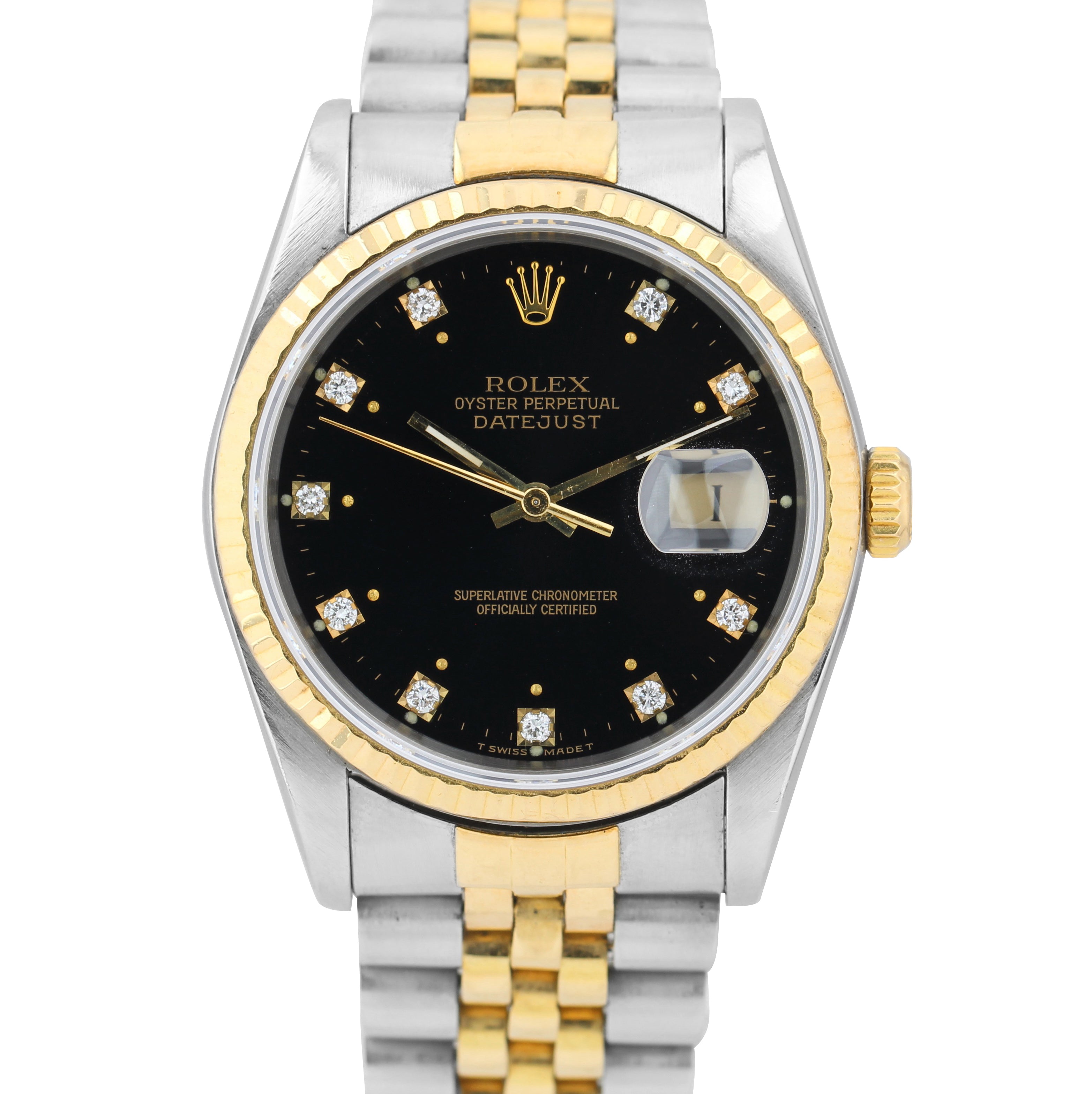 RARE Rolex DateJust 36mm Two-Tone Black Diamond 18K Gold Steel Jubilee 16233