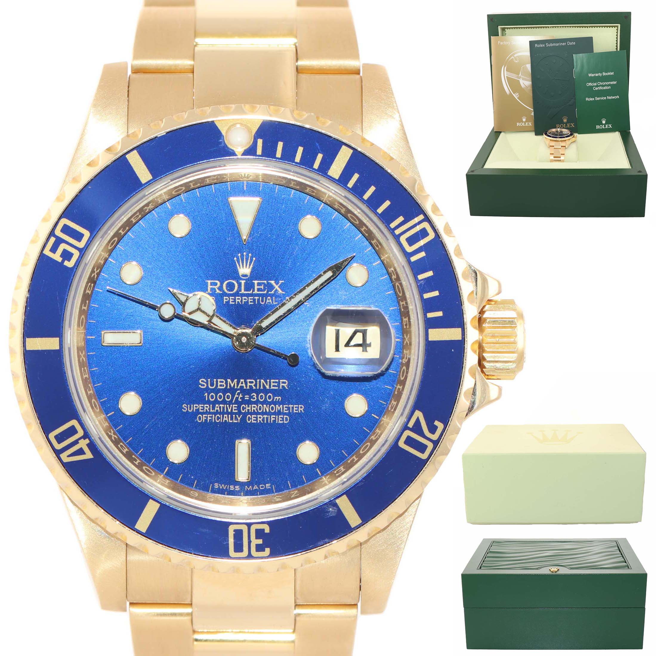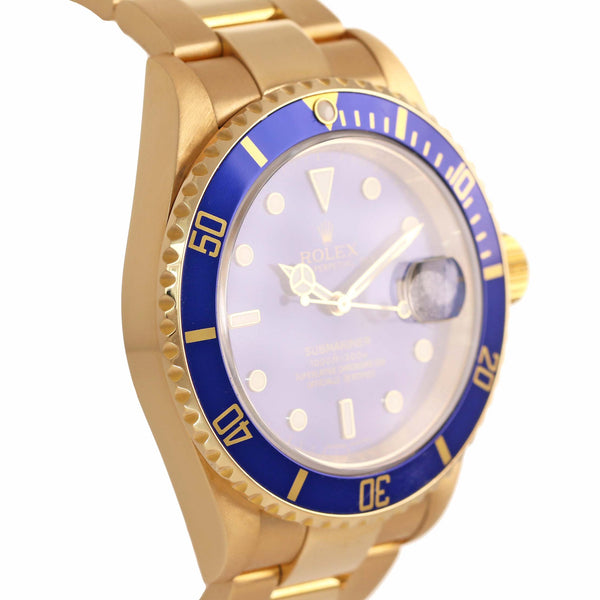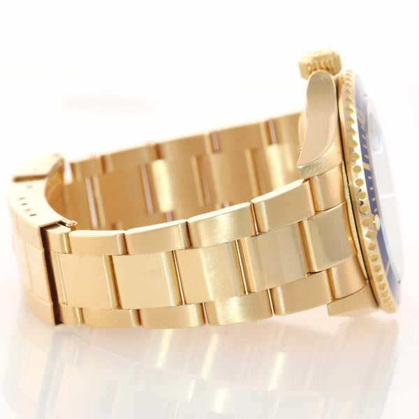REHAUT 2007 Rolex Submariner 16618 18k Yellow Gold Blue No Holes Sunburst Dial Watch and Box.