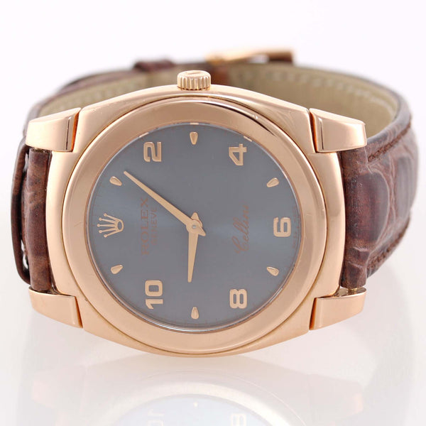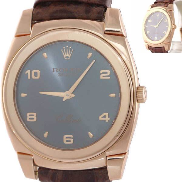 Rolex Cellini 18k Rose Gold Blue Grey Dial Leather Band 35mm Watch