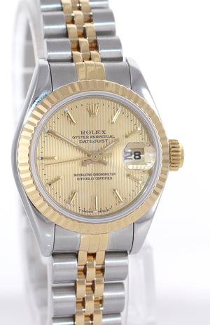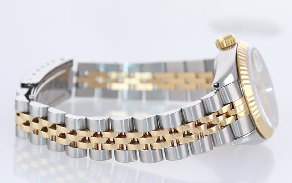 PAPERS Ladies Rolex Oyster Perpetual 69173 Two Tone 18k Gold 26mm Champagne Stick Dial Watch Box