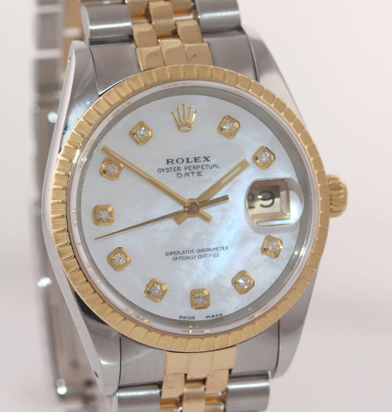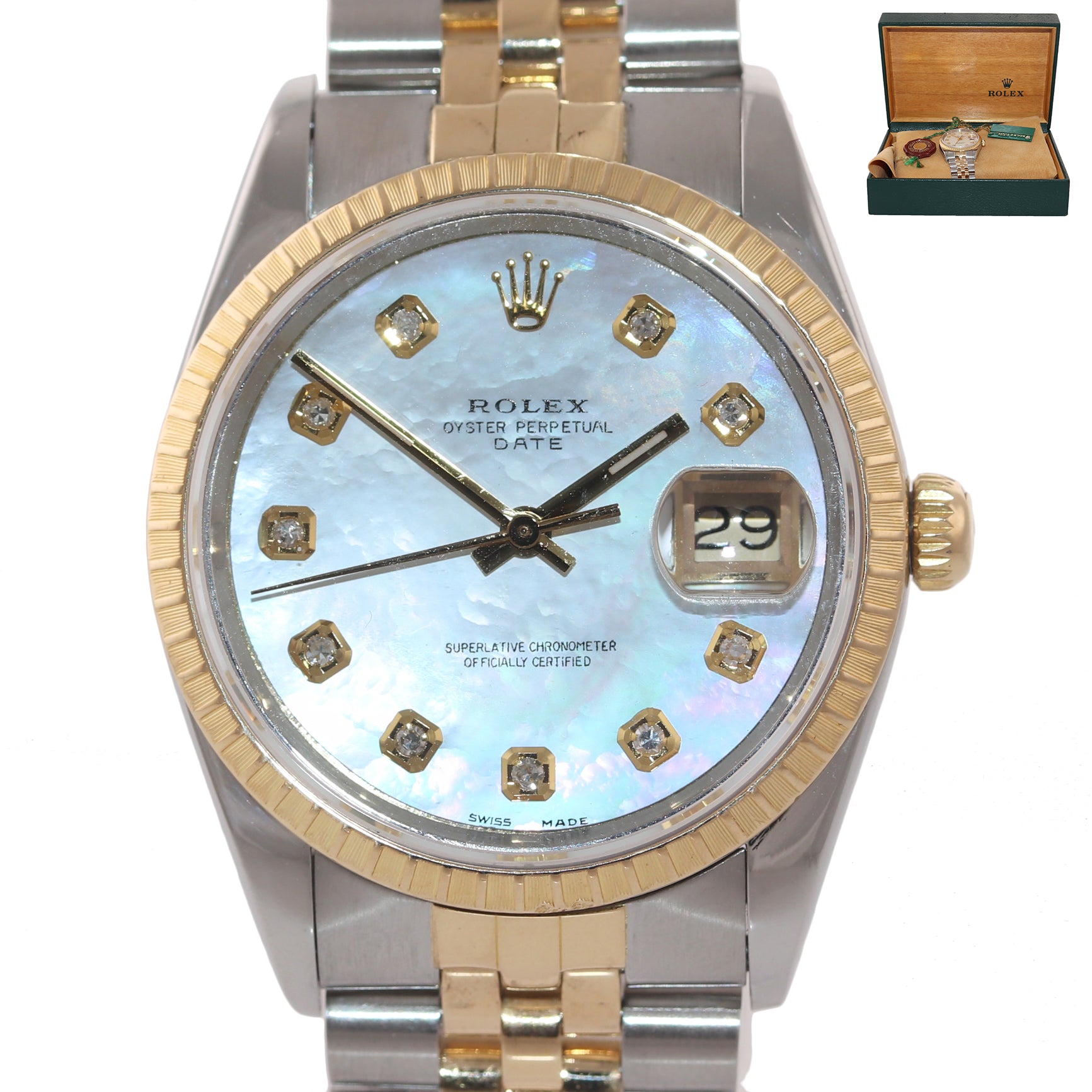 Rolex 15223 Date 18k Gold Steel MOP Diamond 34mm Two Tone Fluted Watch Box