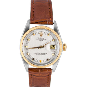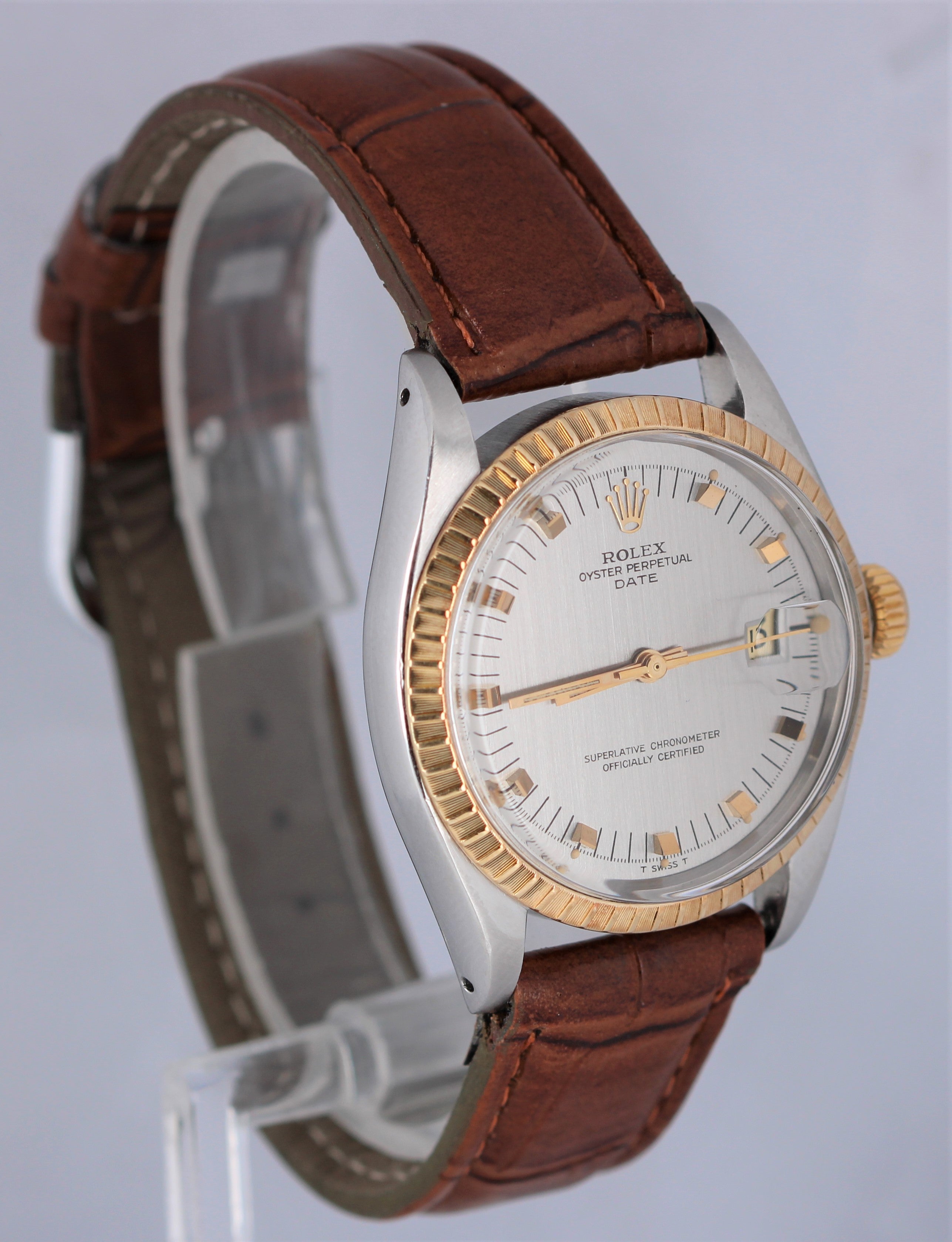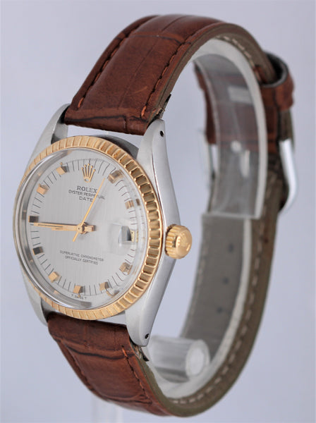 Rolex Date 34mm1505 Two-Tone Stainless Slate Dial "Door Stop" Indices Engine-Turned Gold Leather Band Watch