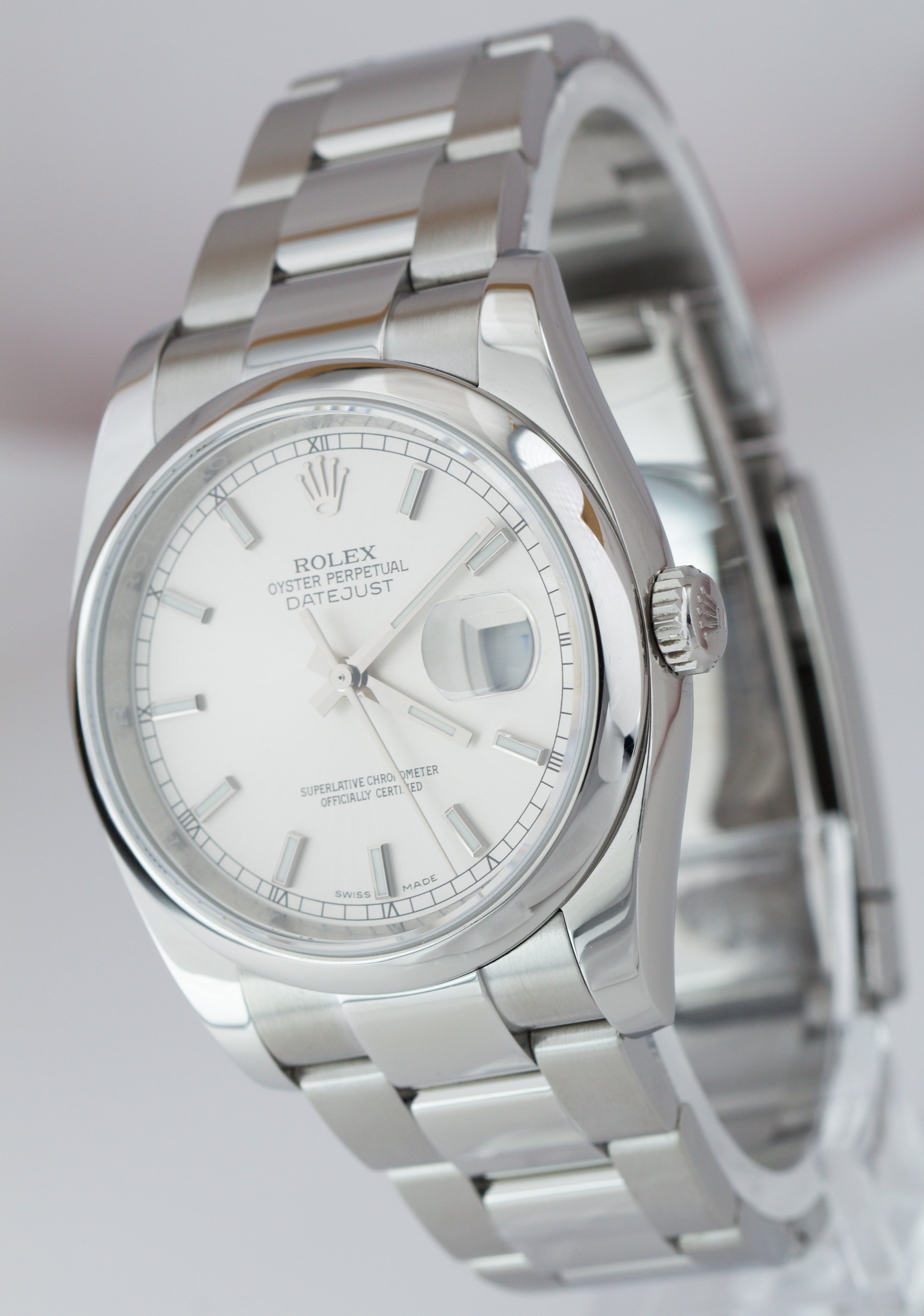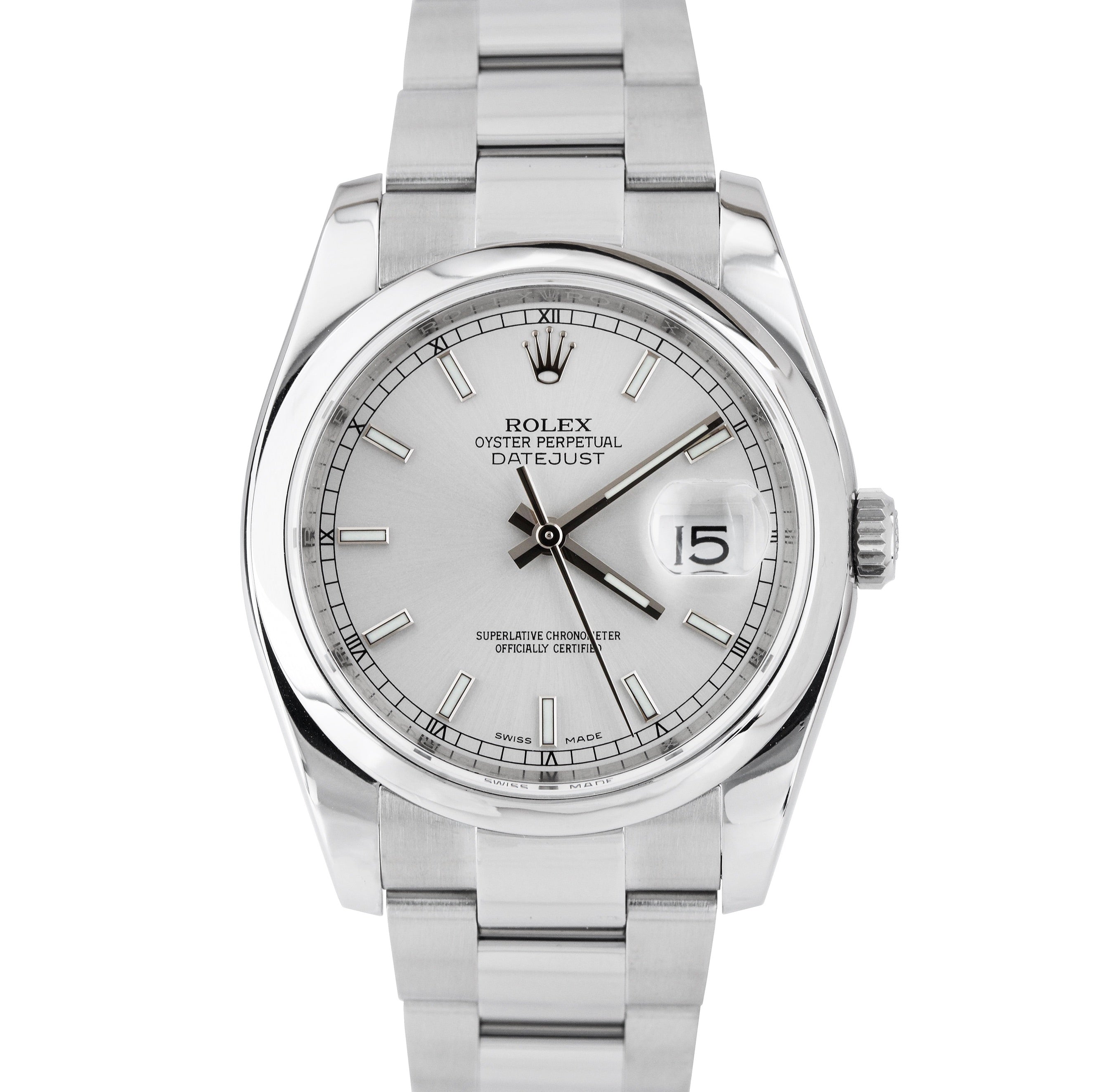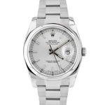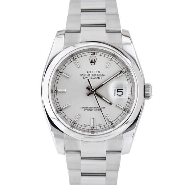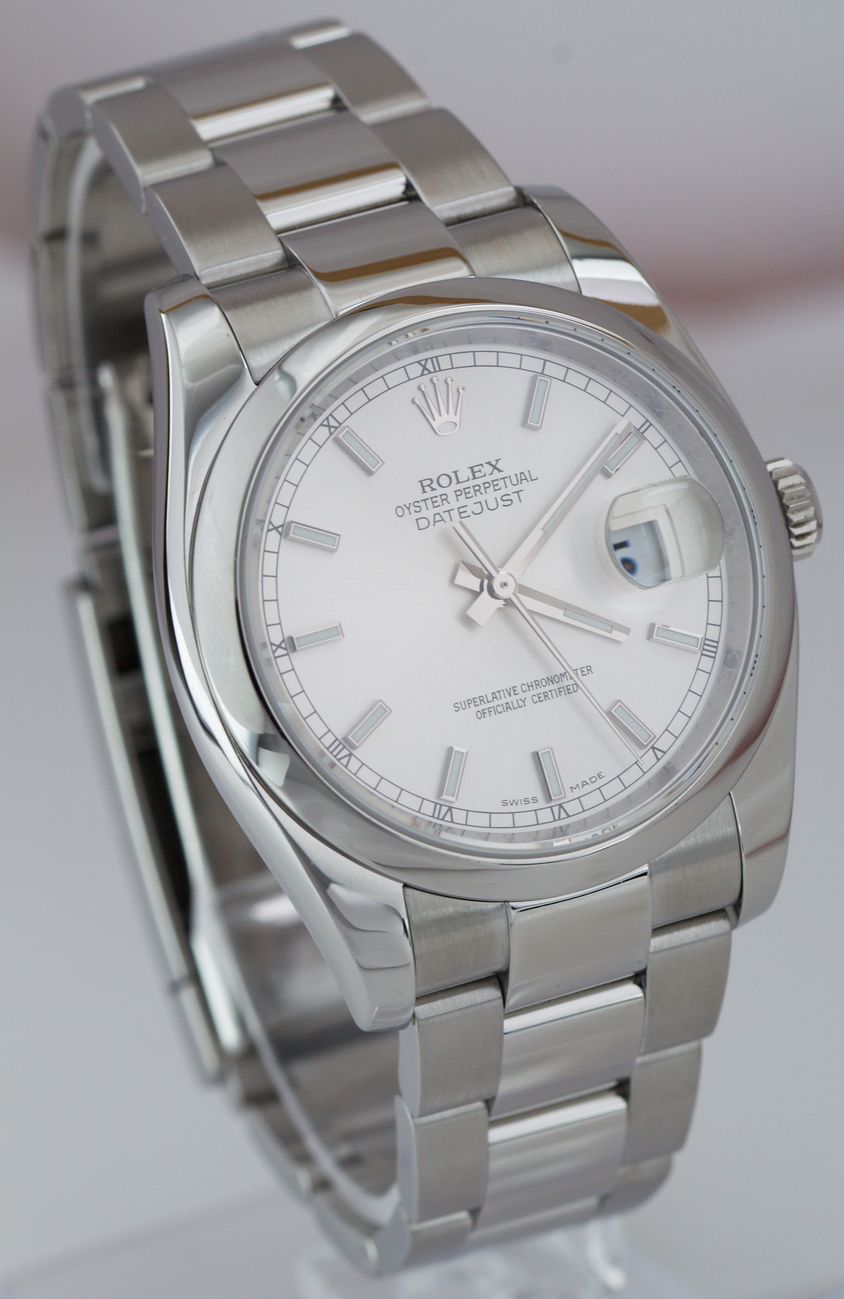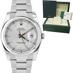 Rolex DateJust Rhodium Silver Stick 36mm Stainless Steel Oyster Watch 116200 B+P