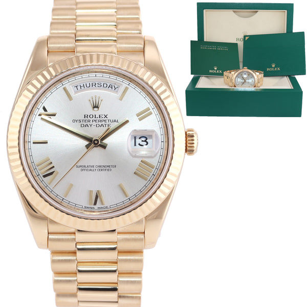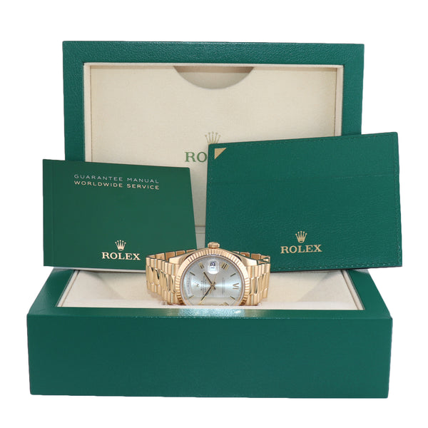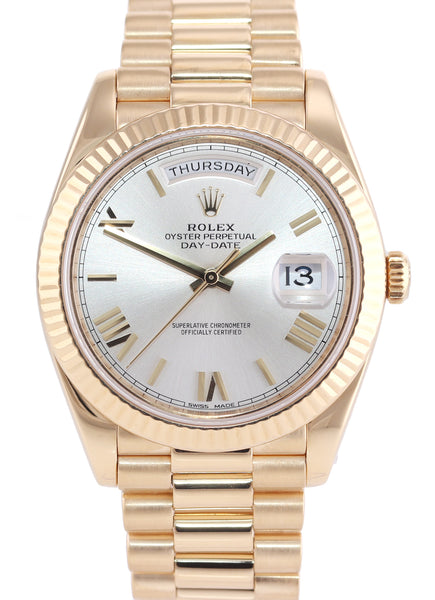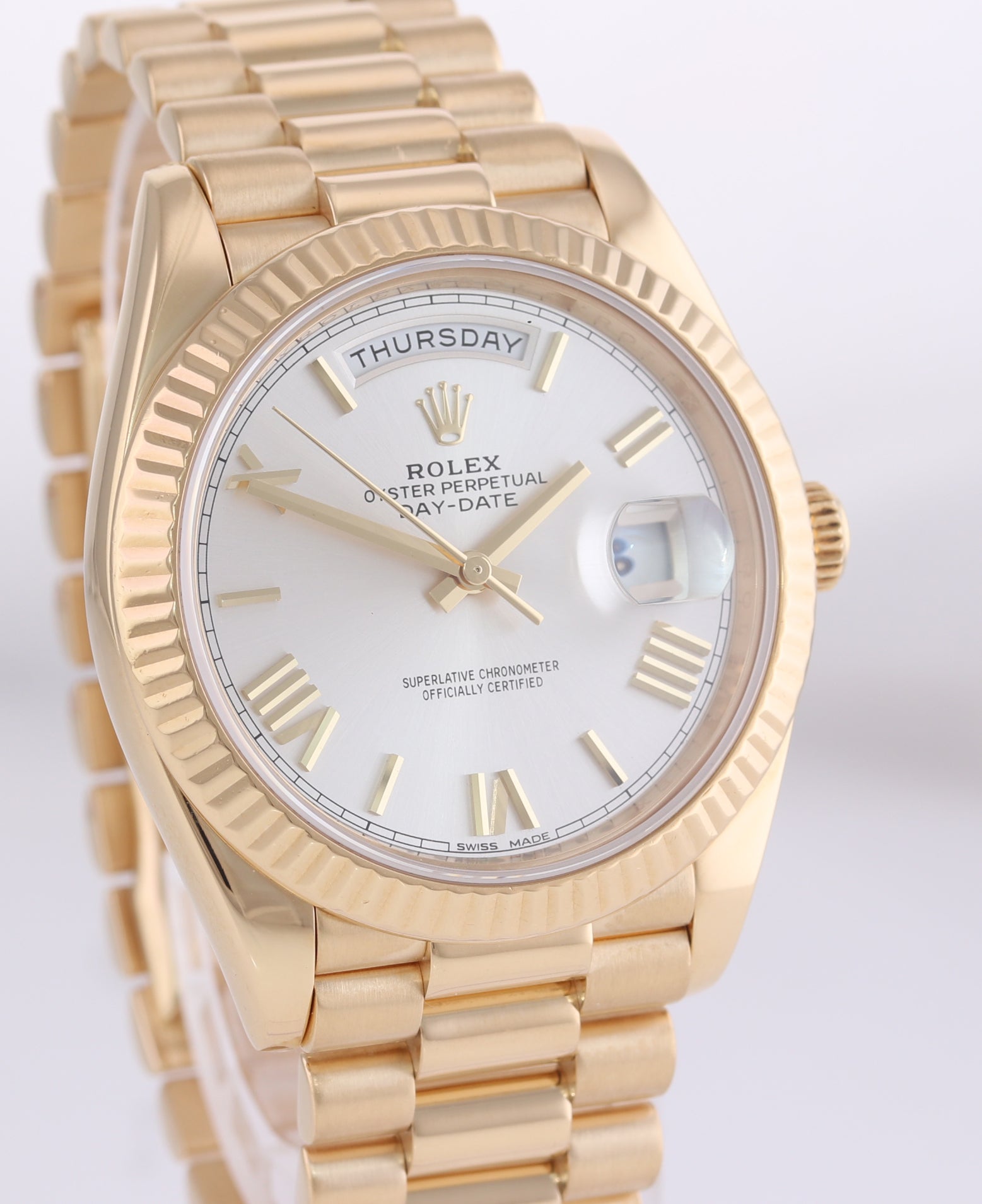 | Dial | Rolex Silver Roman Dial with the day at the 12 o'clock and the date at the 3 o'clock |