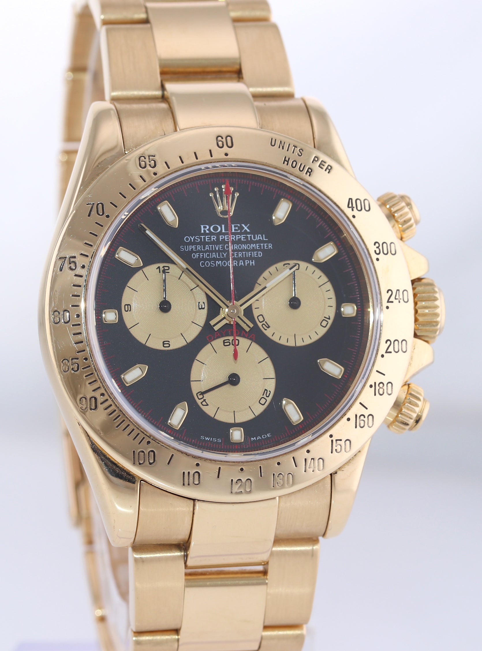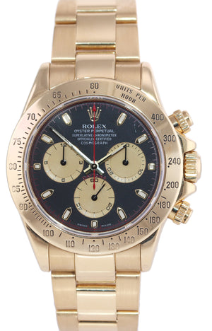| Bezel | Original Rolex 18K Yellow Gold Bezel with an engraved tachymetric scale. |