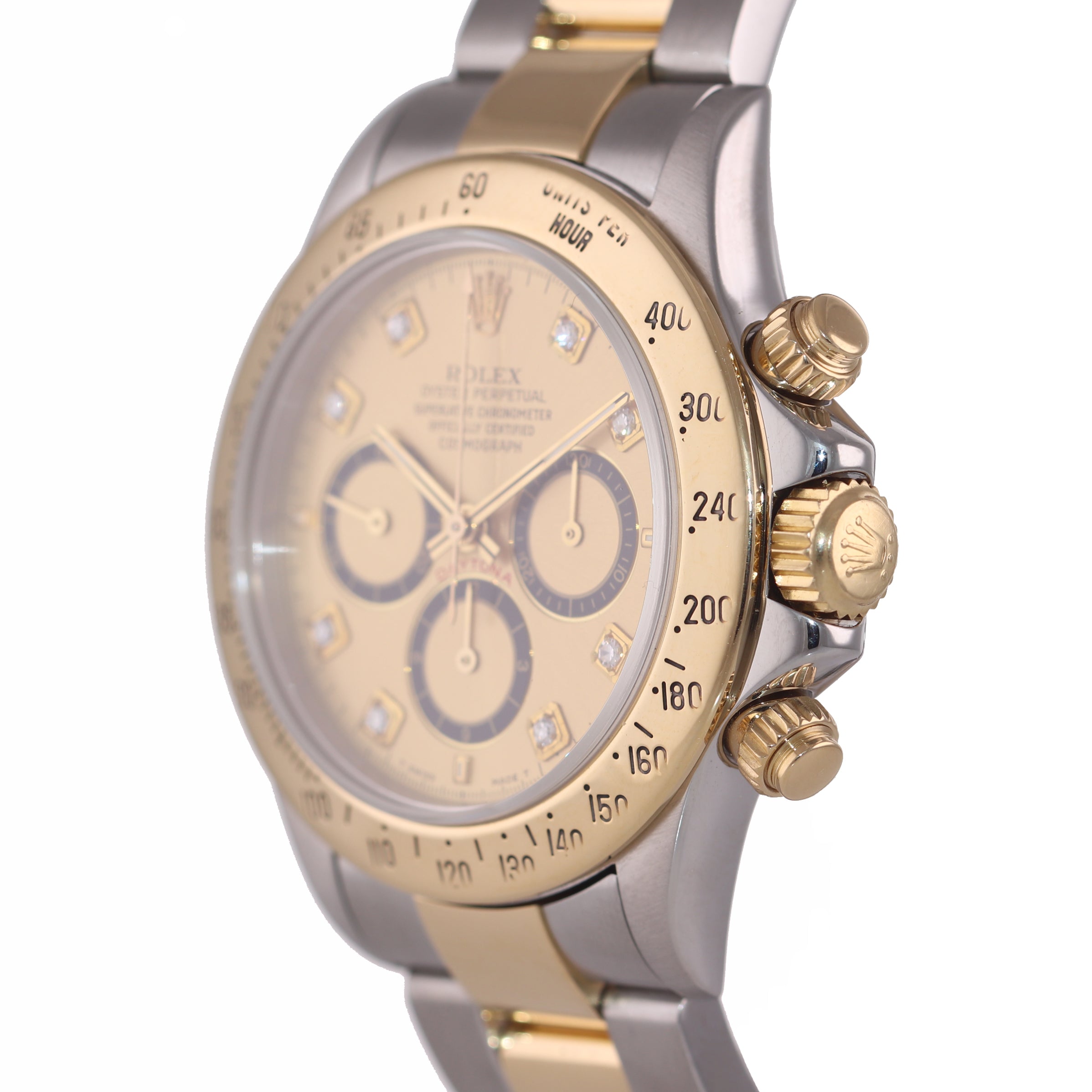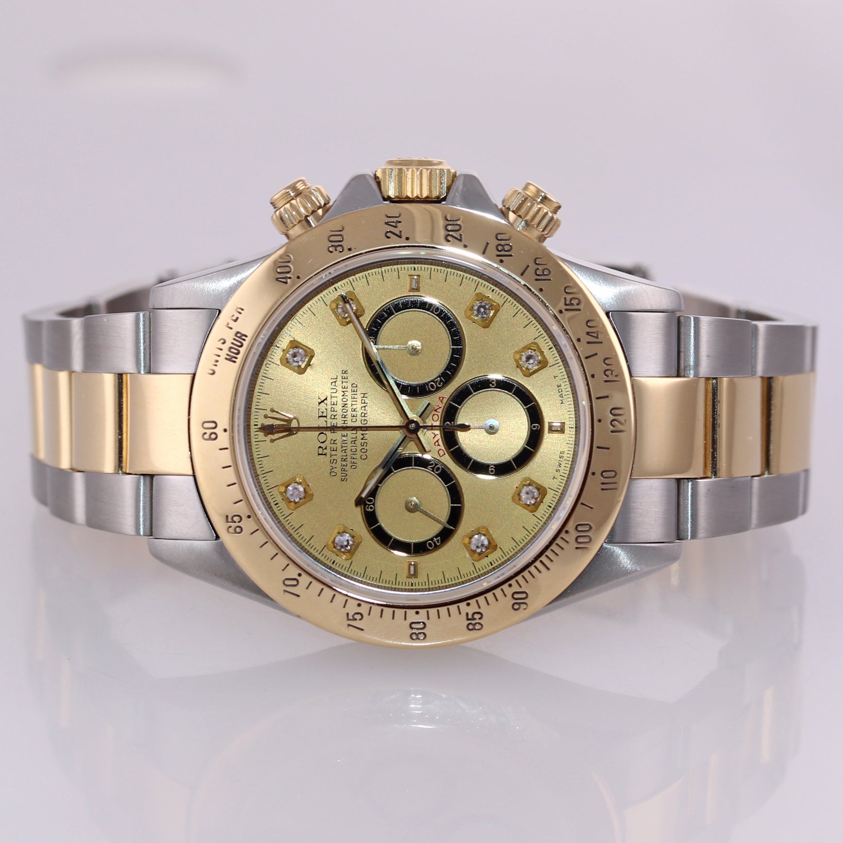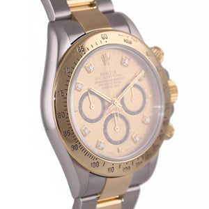 | Dial | Original Rolex Luminous Stick Champagne Chronograph Dial with custom diamond hour markers |