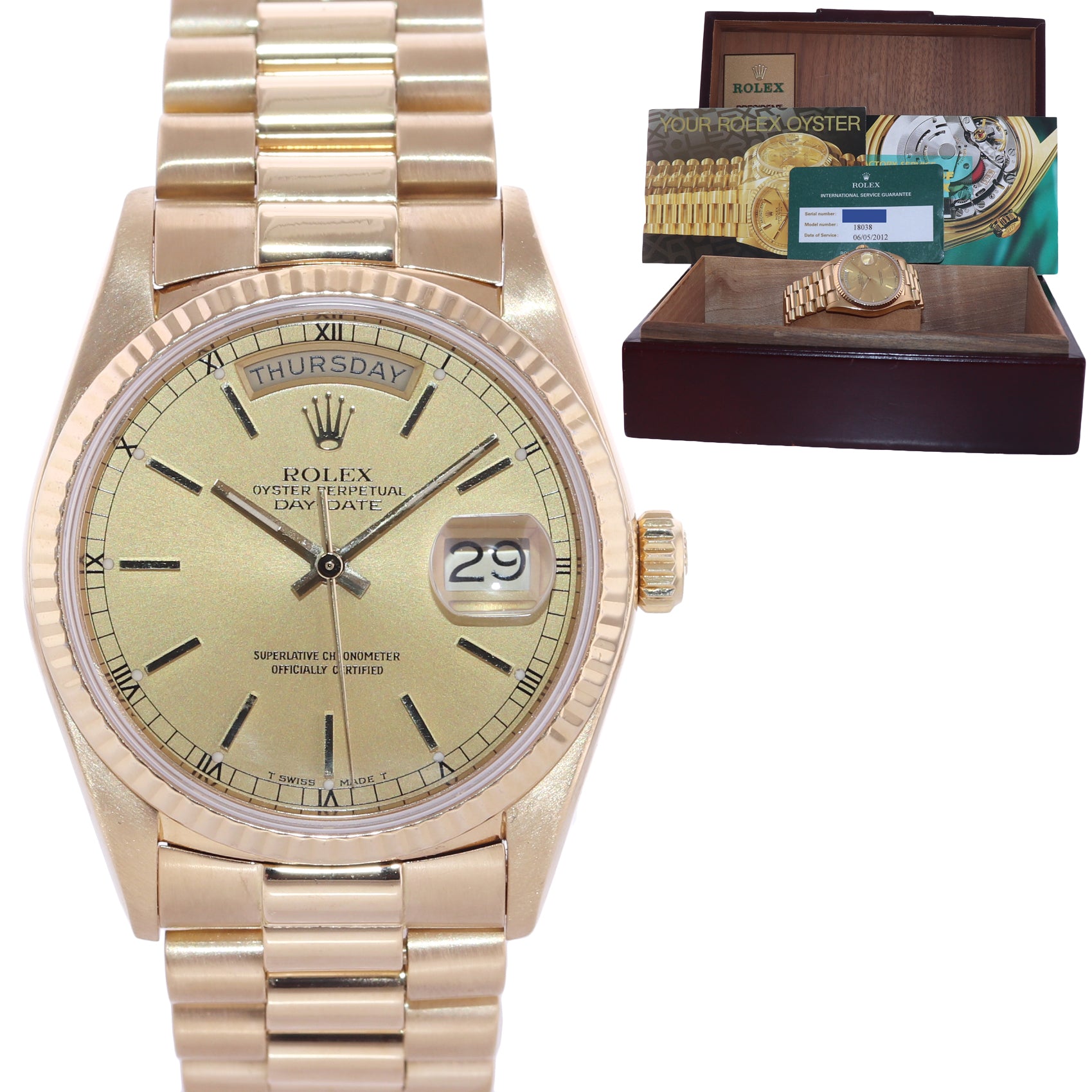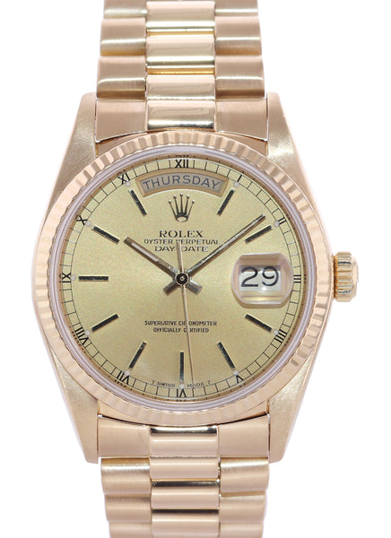 | Dial | Rolex Champagne Dial with the day at the 12 o'clock and the date at the 3 o'clock |