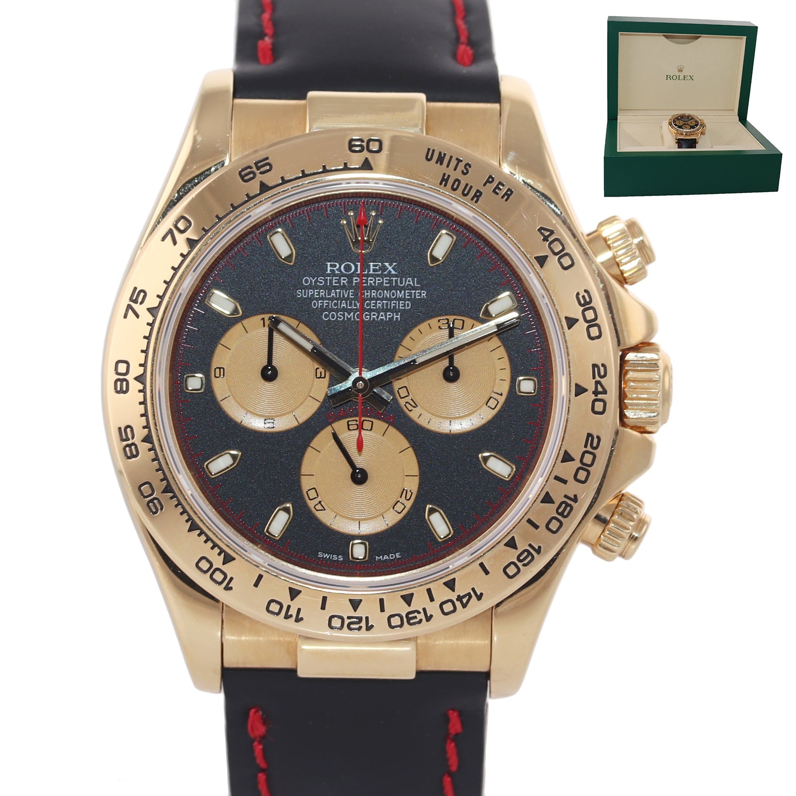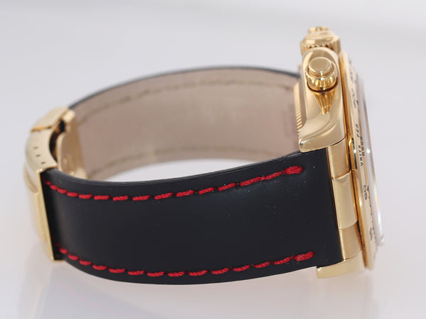 | Band | Custom Rolex Black Leather Strap band with an Original 18K Yellow Gold Flip Lock Deployment Clasp. Band is in excellent condition and has little to no wear. |
