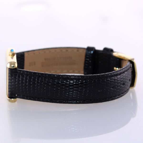 | Band | CUSTOM Black leather band with gold tone buckle |
